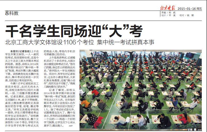 期末集中式考试作为我校综合教改的一项重要举措,严肃考风考纪,激励和引导学生投入更多精力于学业之中,受到了社会媒体的广泛关注。1月16日一早,《色情片晚报》、《色情片考试报》记者赴良乡校区考试现场进行采访。采访的十余位学生表示,考场考纪严格,千人同场考试的方式更加公平、公正,也督促学生在平时更加努力地学习和复习。大家认为,集中考试强化了考试管理,规范了考试秩序,收效明显。随后,两家媒体分别对我校集中期末考试进行了报道。文章一经刊发,人民网、新华网、中国青年网、中国新闻网、现代教育报、中国社会科学网、腾讯网、新浪网、网易网、千龙网、北方网等多家媒体进行了转载。