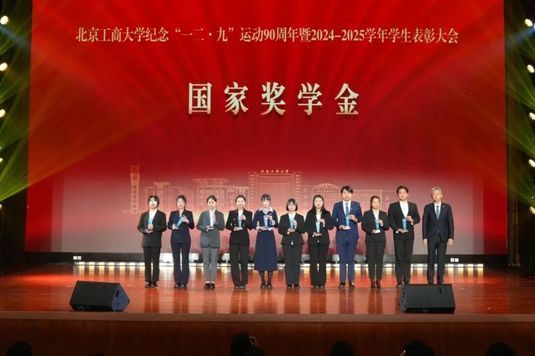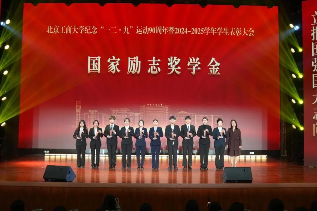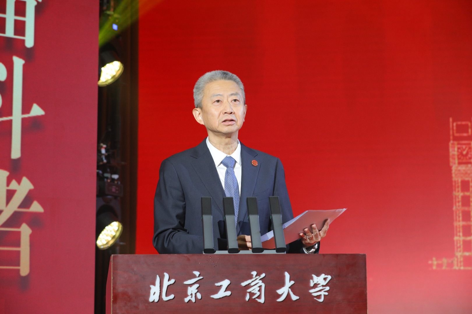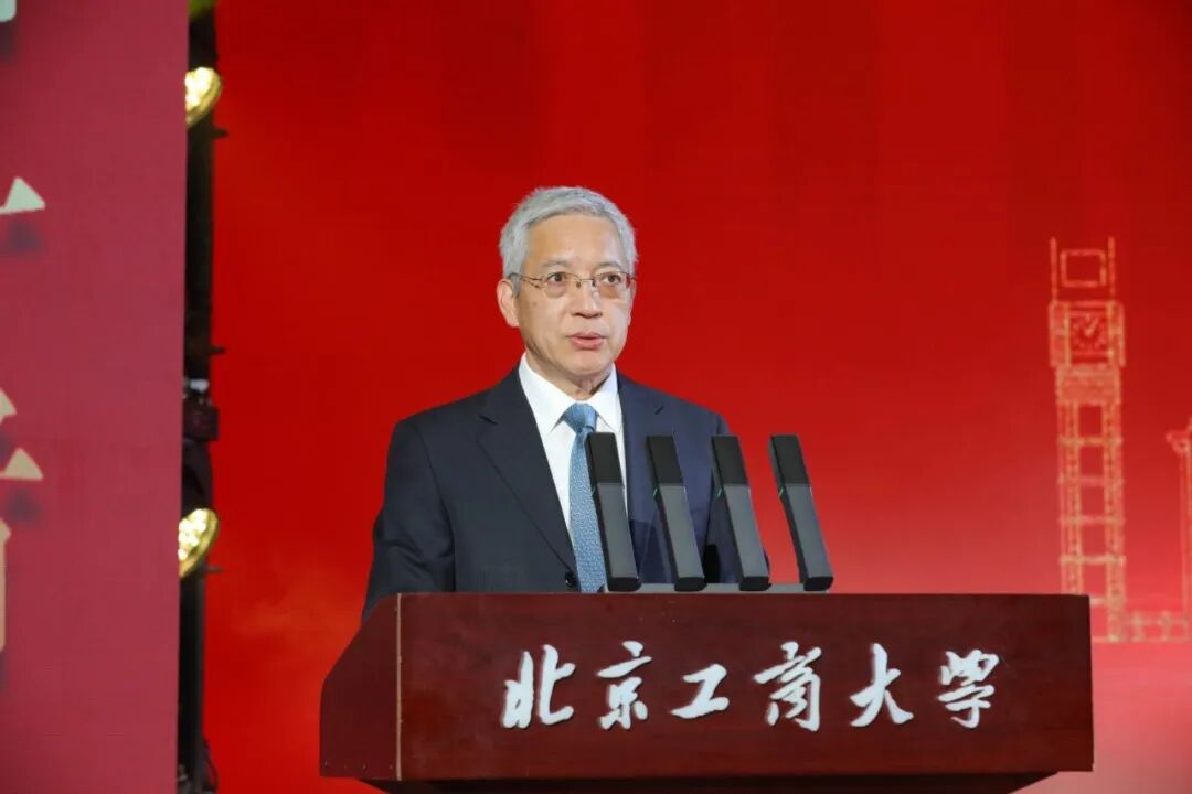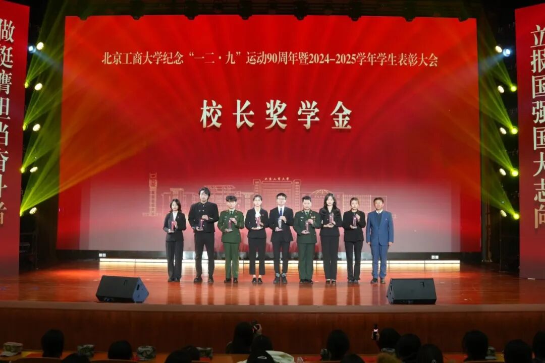 党委书记沈千帆讲话。他代表学校党委向所有获奖个人与集体表示最衷心的祝贺,向辛勤耕耘在育人一线的全体教职工致以最诚挚的敬意。沈千帆表示,七十五年来,学校始终与民族命运同频共振、与国家发展同向同行,作为学校发展的见证者和推动者,过去一年,2300余名北工商学子荣获校级及以上荣誉称号,7600余人次斩获各类奖学金,68个先进班集体脱颖而出,校长奖学金获得者中半数以上已保送顶尖高校深造,多个团队在“挑战杯”“互联网+”等赛事中屡创佳绩,充分展现了同学们过硬的本领和昂扬向上的精神风貌。他为同学们提出三点希望:一是赓续红色血脉,在“爱国奉献”中锚定精神坐标。厚植家国情怀,把爱国情怀转化为奋进力量。二是锻造坚毅品格,在“敢闯敢拼”中筑牢成长根基。将先辈们不畏艰险、勇毅前行的精神基因融入血脉,用坚毅品格托举青春梦想。三是坚持知行合一,在“善作善成”中书写青春答卷。深耕专业沃土,让创新成果绽放在中国式现代化的壮阔征程中。希望同学们坚定不移听党话、跟党走,努力成长为有理想、敢担当、能吃苦、肯奋斗的复合型创新人才,在强国建设、民族复兴伟业中勇担重任、展现风采、贡献力量,书写为中国式现代化挺膺担当的青春篇章。