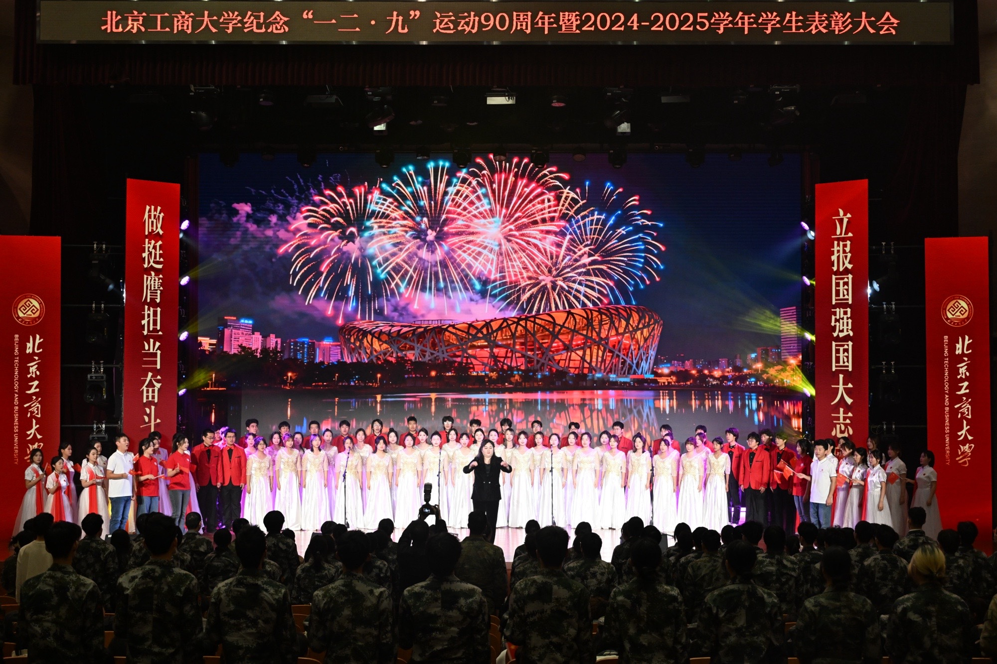 校合唱团登台领唱,台上台下所有同学心手相连,全场形成《歌唱祖国》大合唱,传承“一二·九”精神的磅礴力量,在实现民族复兴的赛道上奋勇争先,跑出属于北工商学子的最好成绩,共同唱响新时代北工商爱国主义最强音!