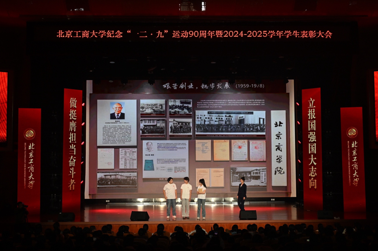 大会在首部校史舞台剧《炬火相传:青春的誓言》中拉开帷幕。该剧以北工商的红色校史为依托,以老校长姚依林为精神符号,艺术化地再现了“一二·九”运动中的真实历史瞬间,以实际行动践行着“请党放心,强国有我”的青春誓言,描绘出北工商青年弘扬伟大抗战精神、与工商共成长、与祖国同奋进的动人图景。这份跨越九十年的青春热血与爱国赤诚,引发全场强烈情感共鸣,掌声经久不息。