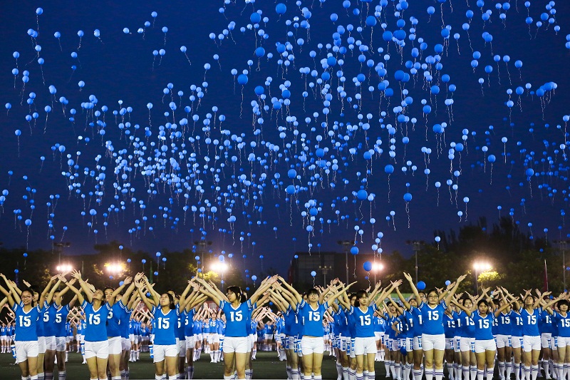 万众期待中,本次开幕式的压轴演出大型健身操《今夜星光灿烂》闪亮登场。此节目由2013年全运会开幕式团体操导演杨夕鹏、黄鸣编导,由全校1020名大一女生参加表演。节目在健身操《今夜舞起来》的基础上,加入我校元素,通过队形变换,运用多种道具,展示出韵律之美和我校学生的良好精神风貌。表演者身着印有数字15的上衣,代表着2015年。他们通过出场队形变换,为我们展现了笑脸、“梦”的图案字样,代表着我校大学生青春活力的笑容、 “中国梦、工商梦”的精神。随后,女生们放飞了自己手中的气球,蓝色的气球与天空交相呼应,融为一体,在观众沉浸于蓝色放飞的绚烂场景时,体育场灯光熄灭,1020名女生举起了携带的手电筒,通过灯光的变换依次展现了“BTBU I LOVE U"的英文字母,在灯光的闪烁中全场高呼,场上队员们的呼声与场下观众的喝彩声融为一体,声声都传递着对母校的热爱。