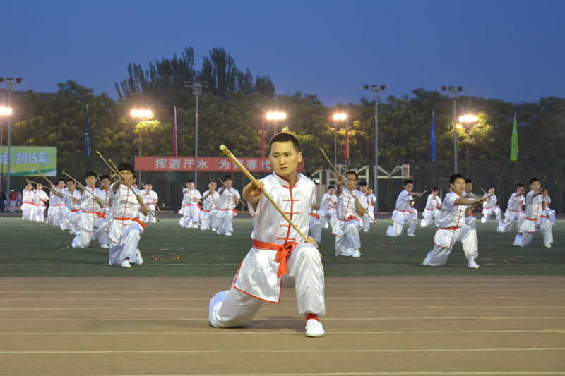 来自理学院、食品学院、材机学院阜成路校区的102名男生身着武术服、手持少林棍豪气满怀地步入绿茵场,化身为一个个武术健将,密集的棍法、快速的动作、勇猛的气势彰显着北工商男生的阳刚之气。