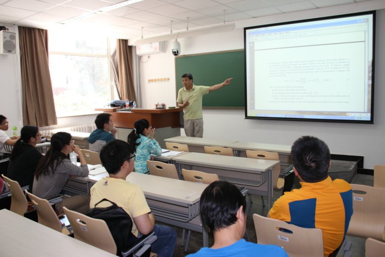 班春生教授此次主要讲授金融数学模型、金融衍生品、期权与期货定价理论等内容。讲授过程中,班教授通过大量的数据实例给学生讲授了相关金融数学模型等方面的内容,并通过列举很多金融资产分析和管理方面的例子来阐述金融衍生品和期权与期货定价理论等内容。班教授讲授内容深入浅出,深受学生喜欢。