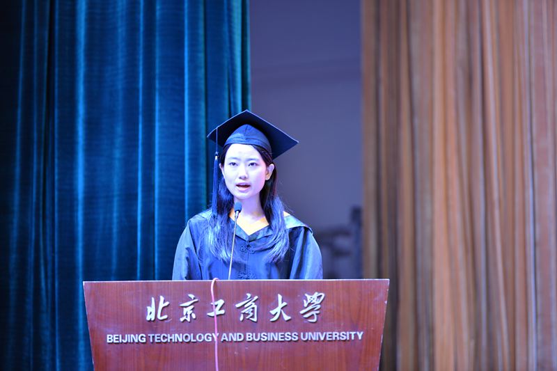 计信学院康晓梅、经济学院周昊佳分别代表毕业生发言。康晓梅以感动为序回忆了母校、师长为学生成长成材所付出的努力和支持,细数四年间学校的点滴发展改变,代表全体同学为母校送上祝福。周昊佳同学从与母校的相遇、相识,再到相扶,回忆了大学时光,对亲朋、学校表达了谢意,并号召全体毕业生奋力拼搏为母校增光添彩。