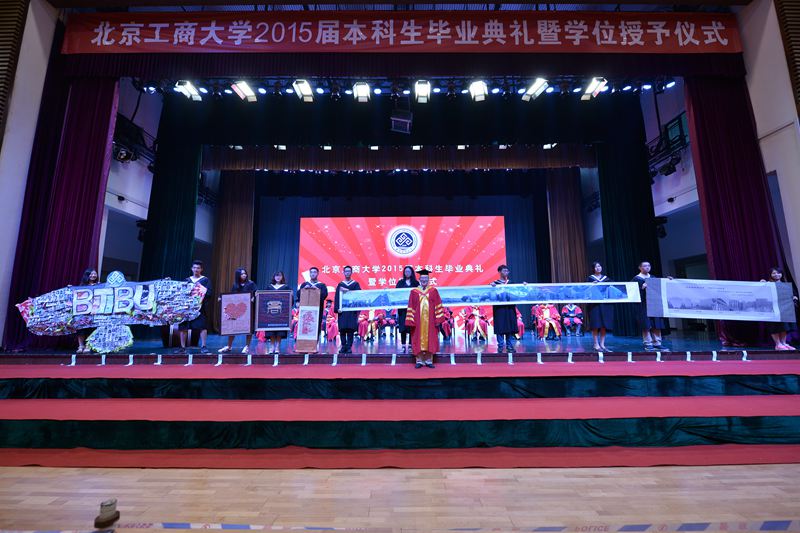 来自9个学院的毕业生满怀感恩之心为母校献礼以表达对母校、对老师的不舍和祝福。党委书记谭向勇代表学校接受了礼物。理学院为母校献上了名为“理”想之翼的风筝;食品学院送来竹简版《论语》;材料与机械工程学院为母校送上桃李满天下字样的笔筒;计算机与信息工程学院将师生设计的一台语音控制人形机器人献给母校;经济学院将毕业生亲手制作的“雄鹰”风筝赠与学校;商学院毕业生为母校手绣一幅名为“心系”的绣品;法学院赠送了剪纸作品“岁寒三友”;外国语学院献上了由毕业生自主设计制作的8米卷轴工商楼宇晨夕图;艺传学院382名毕业生将学校综合楼、耕耘楼、文二楼等场景绘制成卷轴皮雕画献给母校。