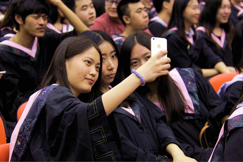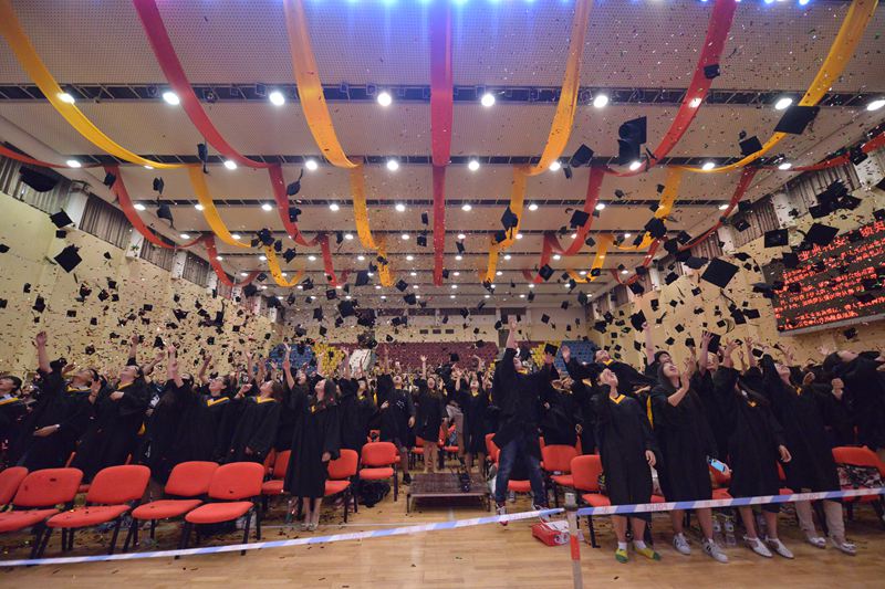 写满了喜悦、飞扬着笑声的毕业典礼为四年大学生活画上了圆满的句号。伴随着阵阵热烈的掌声和欢呼声,一顶顶学士帽被抛向空中,寓意着放飞青春和梦想。祝愿毕业生们,在母校牵挂的目光中绽放青春的光泽,续写梦想的新篇章,牢记母校教诲,攀上人生的新高度!