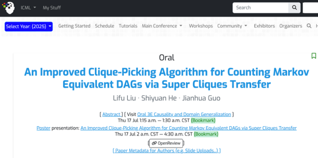 近日,我校郭建华教授团队在因果推断算法研究上取得重要突破。郭建华教授团队在国际机器学习与人工智能顶级会议——第四十二届国际机器学习会议(International Conference on Machine Learning, ICML)上提交的论文“An Improved Clique-Picking Algorithm for Counting Markov Equivalent DAGs via Super Cliques Transfer”(基于超团转移的团选取算法快速计算马尔可夫等价类规模),入选全部投稿论文前1%,被评选为口头报告论文。