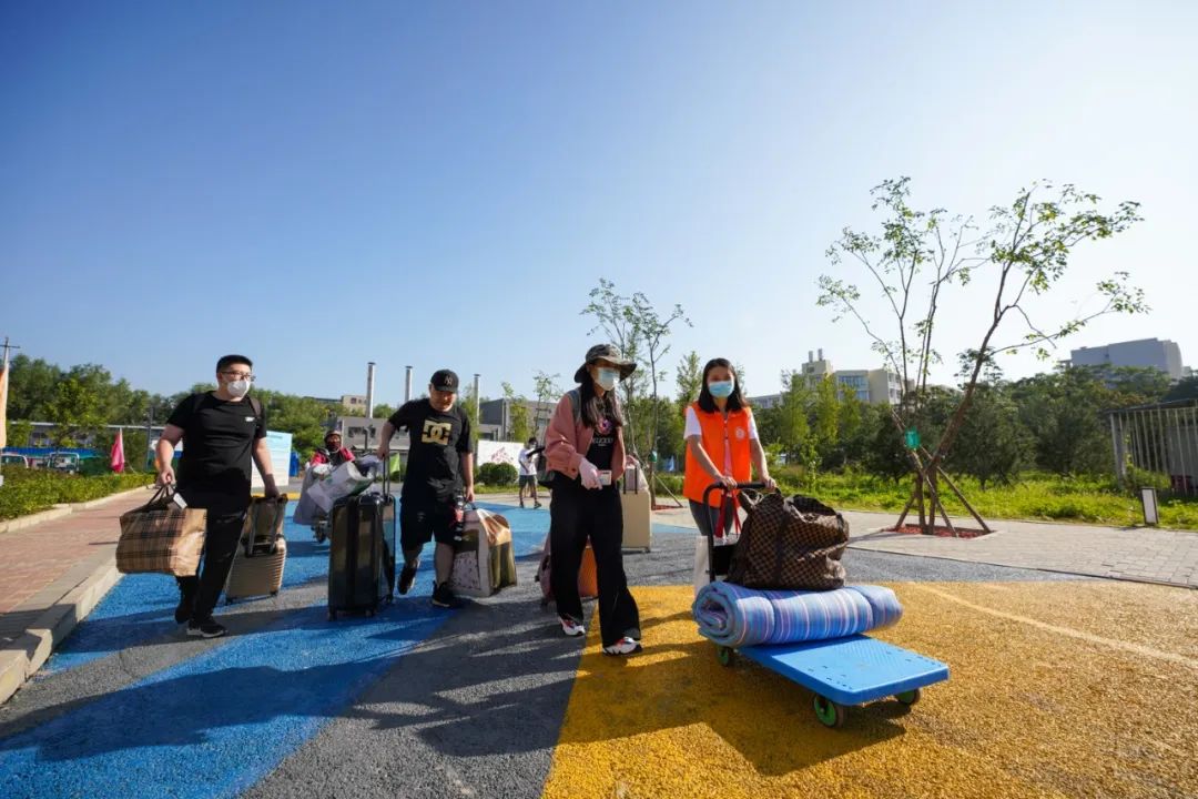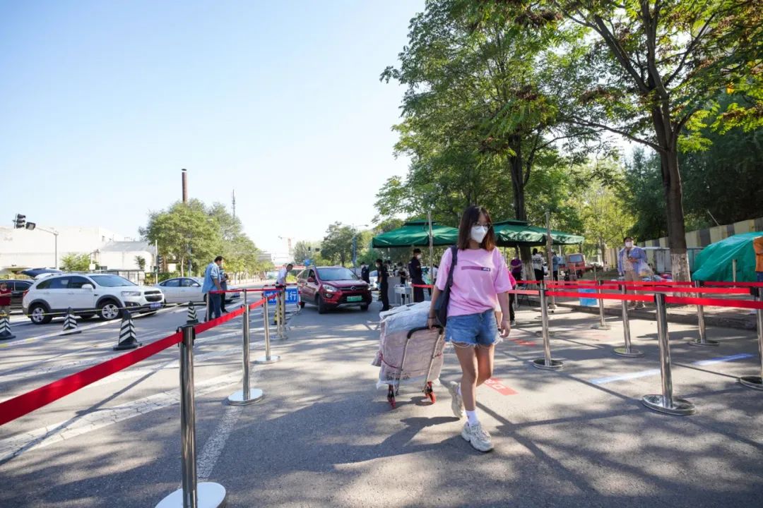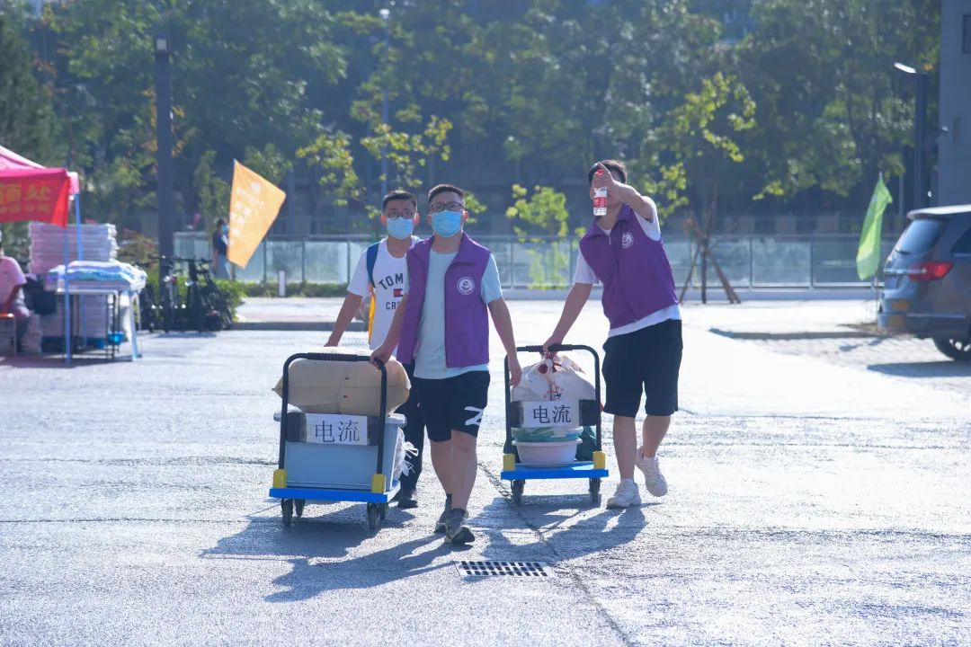 学校对每位入校的新生进行严格把关,校门外,安保人员细致核验新生身份与健康信息,并进行测温。根据疫情防控要求,家长不能入校陪同,志愿者们排成一行随时待命,帮助新生搬运行李,引导护送新同学顺利前往迎新点,搭建起一条畅通无阻的行李“传送带”。