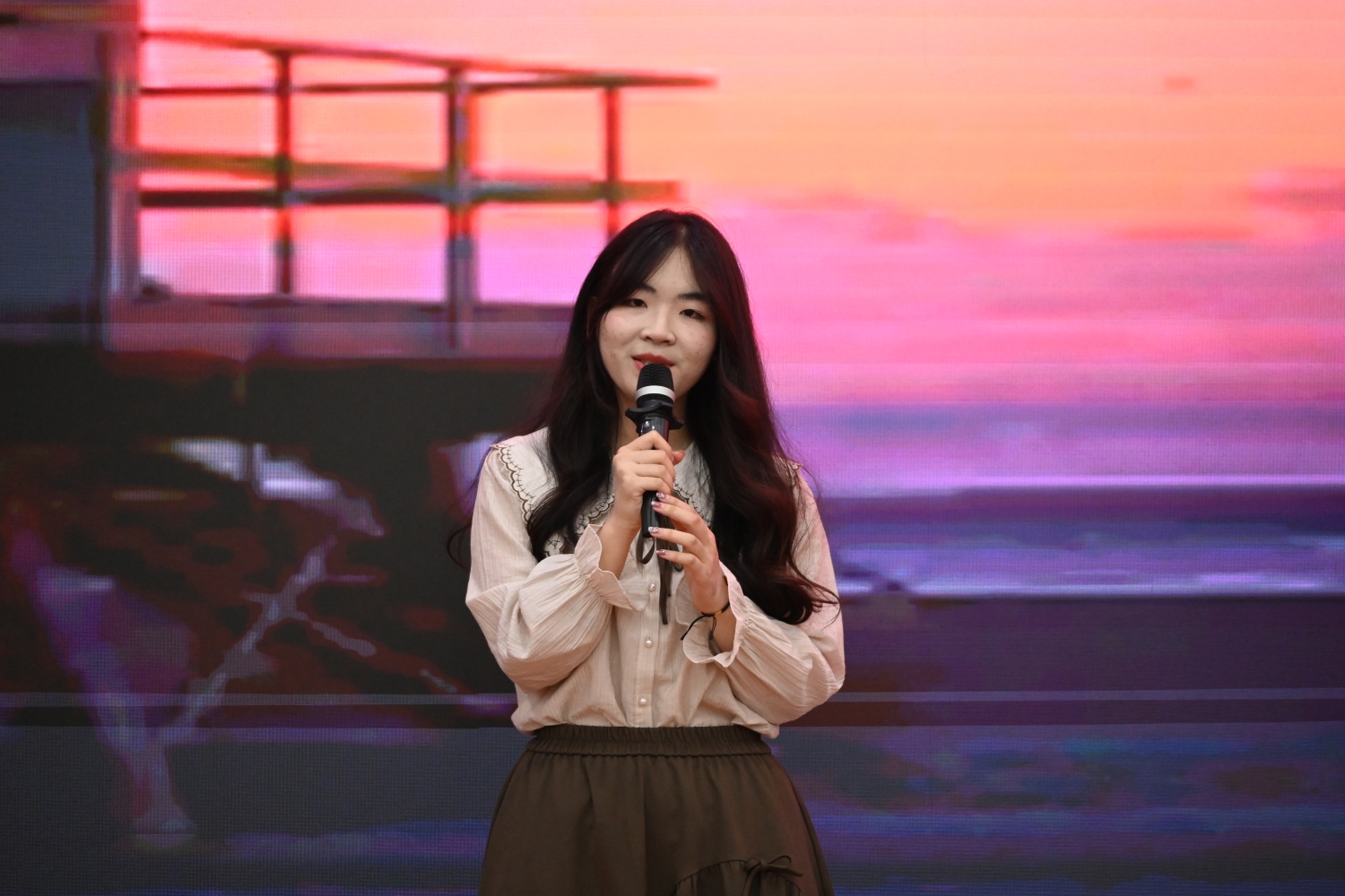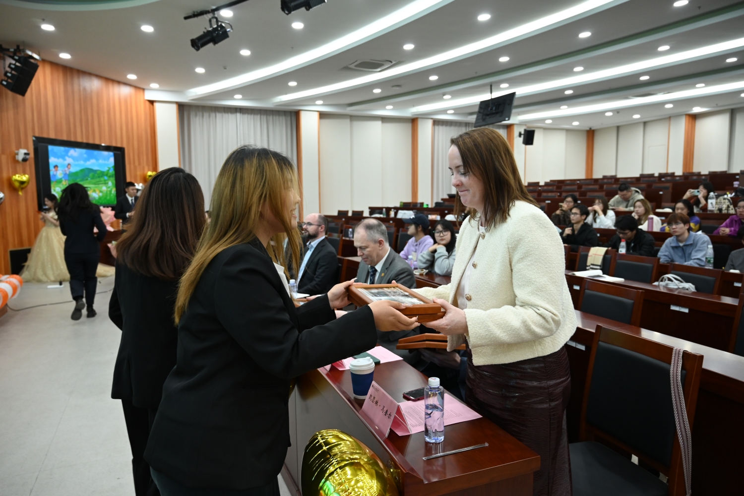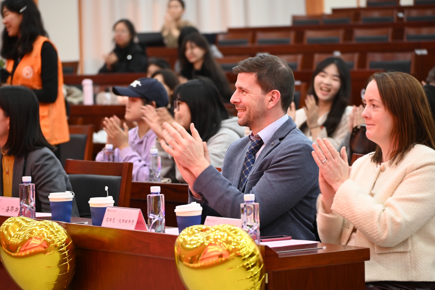 在座谈交流环节,国际班学生代表李沛芷、王锡平依次上台,分享他们在国际班的学习生活点滴,讲述了在大学生活中如何克服困难、不断成长,展现了国际班学生积极向上的精神风貌。
