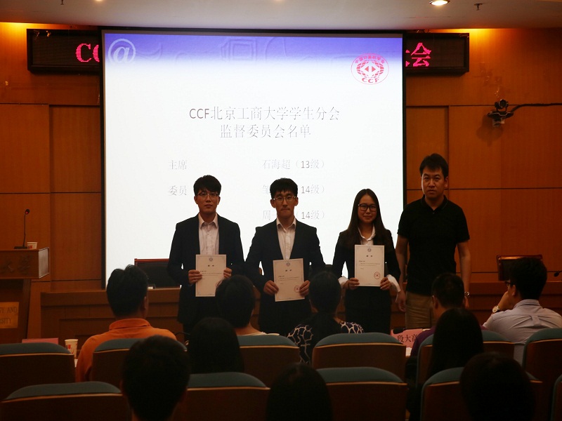 会上,戴丽霞代表CCF为指导委员会成员颁发了聘书,陈谊为CCF我校学生分会执行委员会成员颁发了聘书,张凯伟为CCF我校学生分会监督委员会成员颁发了聘书。学生代表接受了CCF学生分会会旗,李芮同学作为CCF我校学生分会主席宣读誓词。