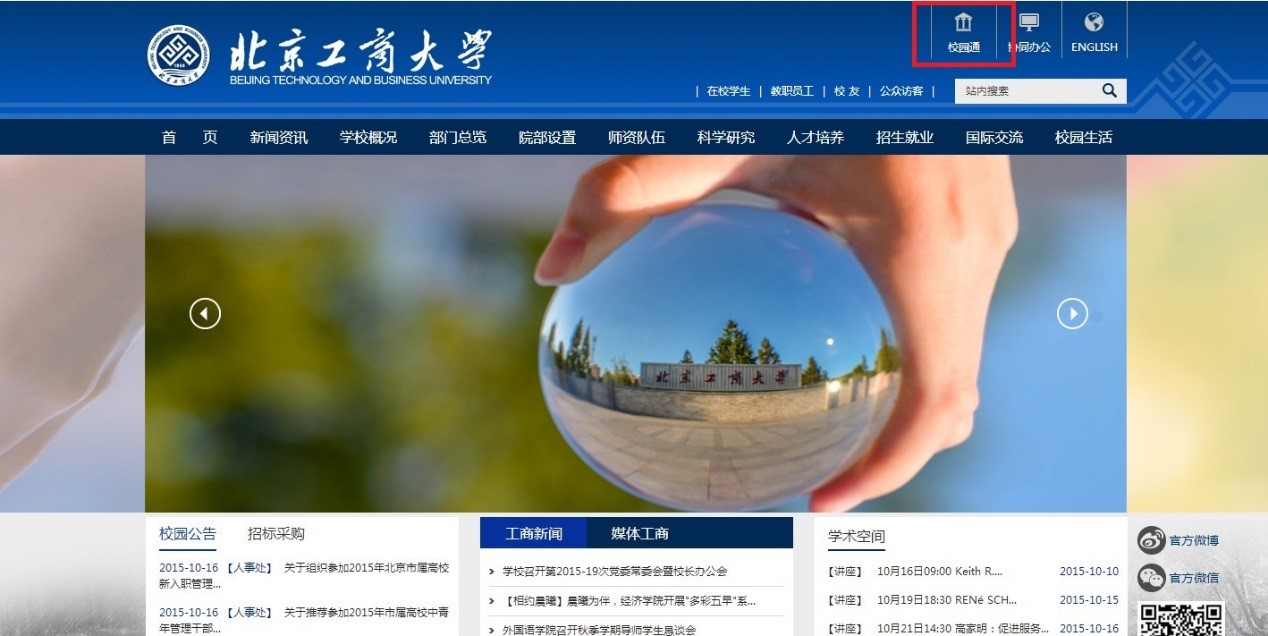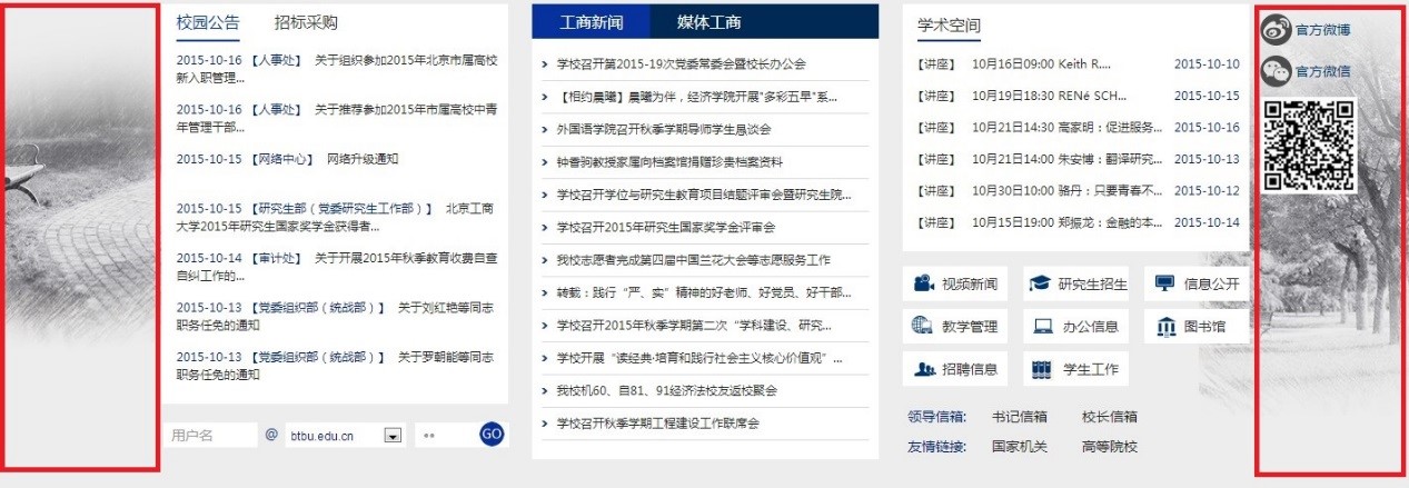 页面右侧有我校官方微博链接及官方微信二维码,通过点击、扫描可直达。页面底端保留了学校邮箱入口,方便登陆。