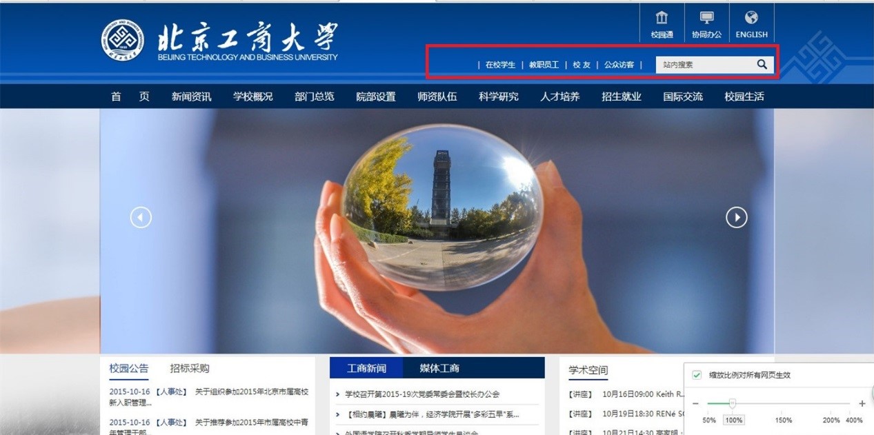 为节约空间、增加内容,新版校园网设计同区域多选项展示,利用选项卡,用户可通过选择工商新闻、媒体工商,校园公告、招聘采购,将鼠标放置内容栏目条,栏目内将显示相应内容。此外,用户如果想浏览某栏目的更多内容,点击相应栏目条即可,如光标点击“校园公告” 上可以展示前20条公告及后续内容。