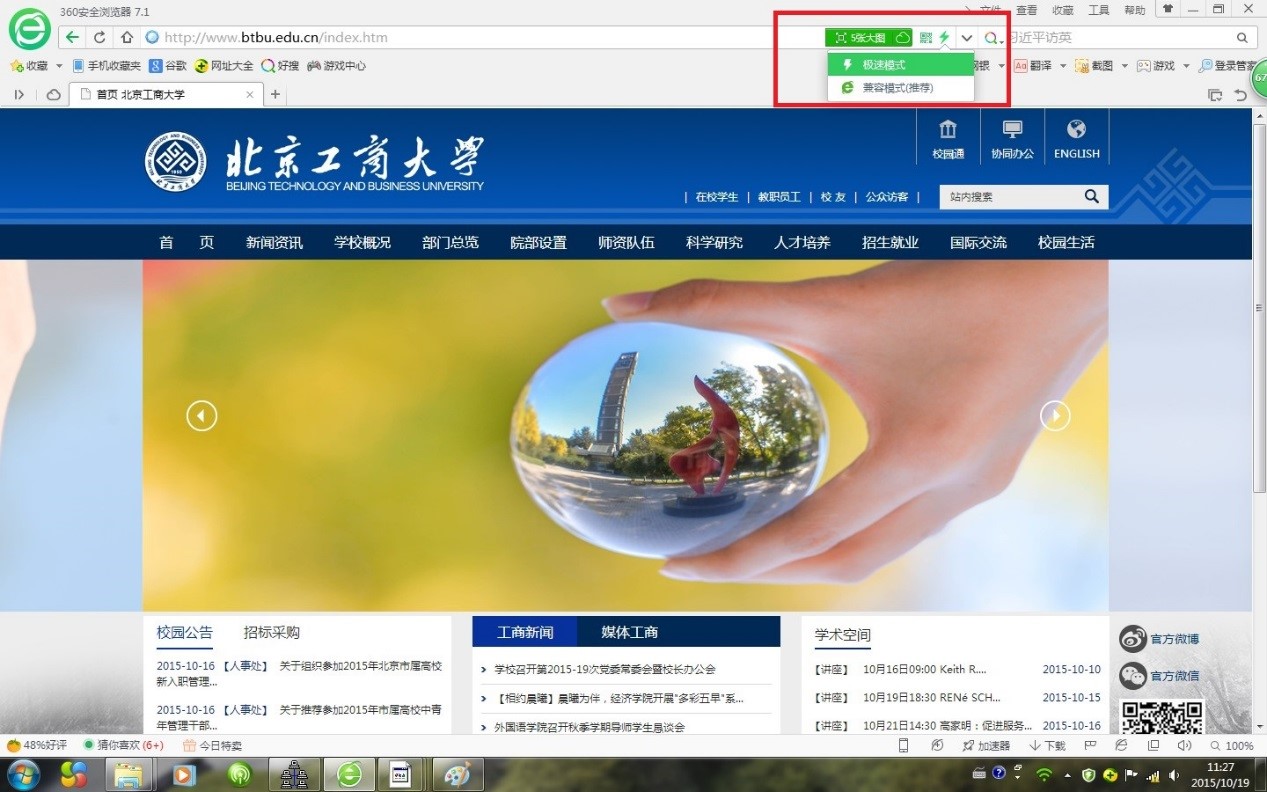 目前校园网新闻图片仍按照品字形排列,部分电脑图片显示变大或错误排列(如上图),可更换浏览器重新打开,如使用为360浏览器,可点击网站地址栏右侧绿色标志(如下图)将浏览器模式改为极速浏览页面图片即显示正常。
