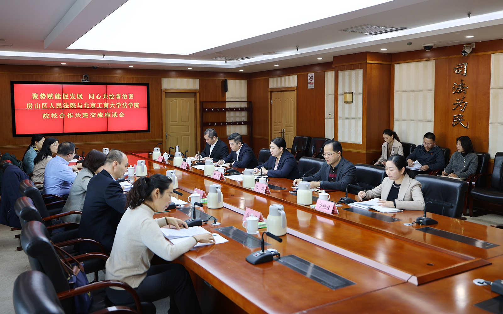 我校一行人员来到房山区人民法院一层大厅,在政治部讲解员引领下,参观了房山区人民法院成就图片展。随后,在房山区人民法院会议室,房山区人民法院党组书记、院长齐莹带领在院班子成员与我校一行人员开展了“聚势赋能促发展 同心共绘善治图”的主题座谈会。会议由房山区人民法院党组成员、副院长沈波主持。我校法学院党委书记胥阳、院长陈敦、党委副书记孙惟佳、诉讼法系主任王晴、基层法治研究中心副主任郭纹静参与调研和座谈交流。