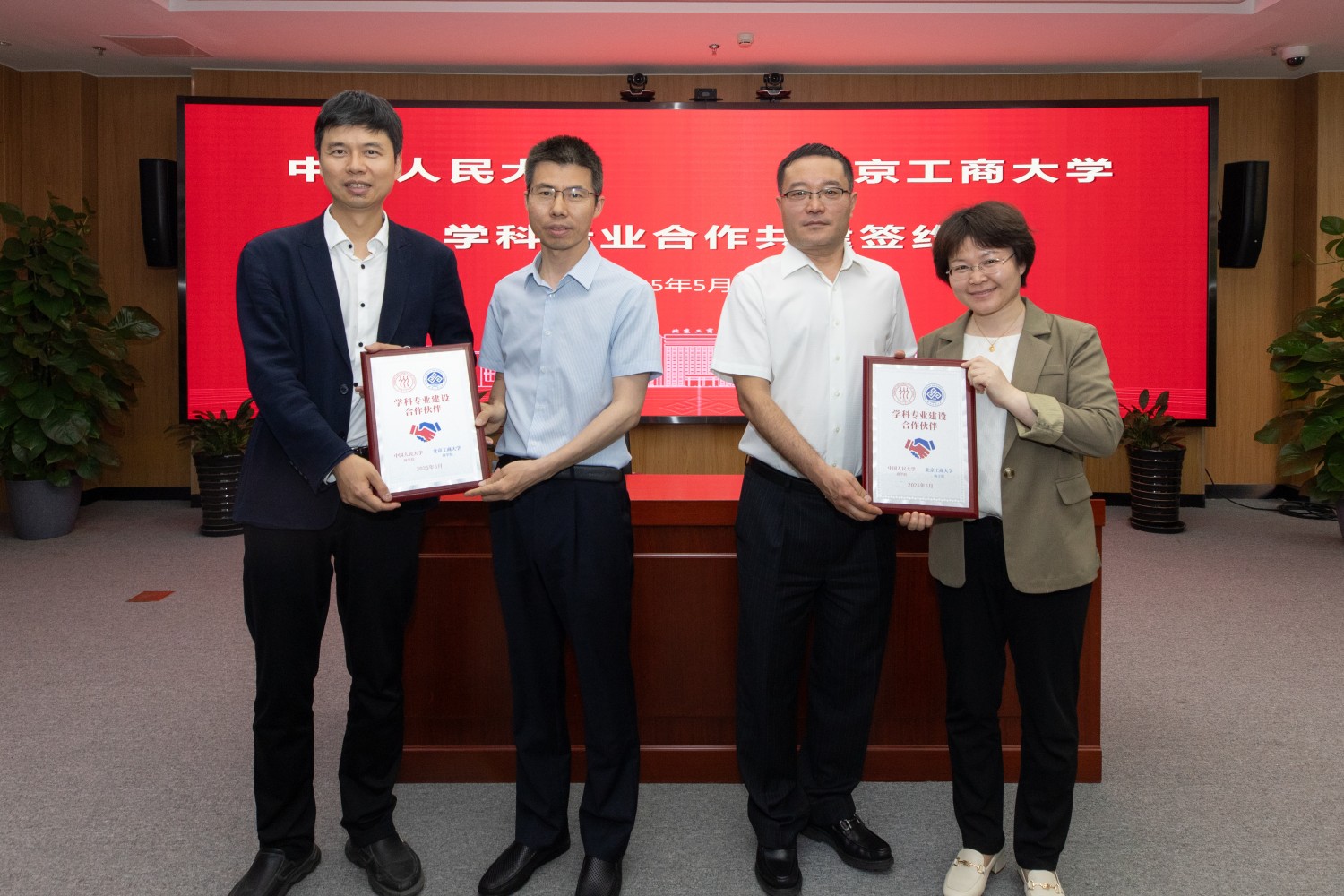 中央财经大学统计与数学学院院长贾尚晖和我校数学与统计学院党委书记周艳杰签约;李涛和刘艳楠为双方颁发签约纪念牌。
