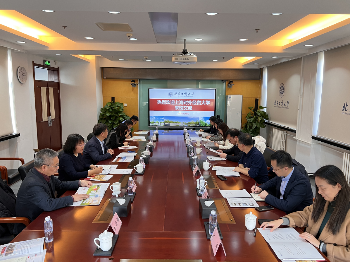 郭建华代表学校对上海对外经贸大学一行的到来表示热烈欢迎,并介绍了学校的历史沿革、目标定位,以及近年来学校在人才培养、学科建设、科学研究、社会服务等方面取得的成绩。他指出,学校紧密围绕高水平研究型大学建设这一主线;全面落实良乡主校区及阜成路校区两校区发展规划;加快推进发展定位向服务国家和首都经济社会发展转型、办学方向建设高水平研究型大学转型、教育模式向教育数字化转型三大转型;稳步推进经管学部、轻工与食品学部、数据科学与人工智能学部以及人文社科学部四个学部改革。希望两校相互支持、荣辱与共,推动实现共同进步。