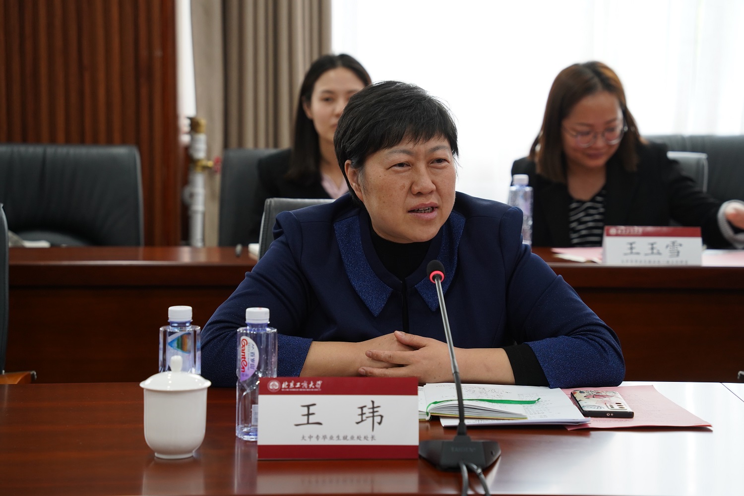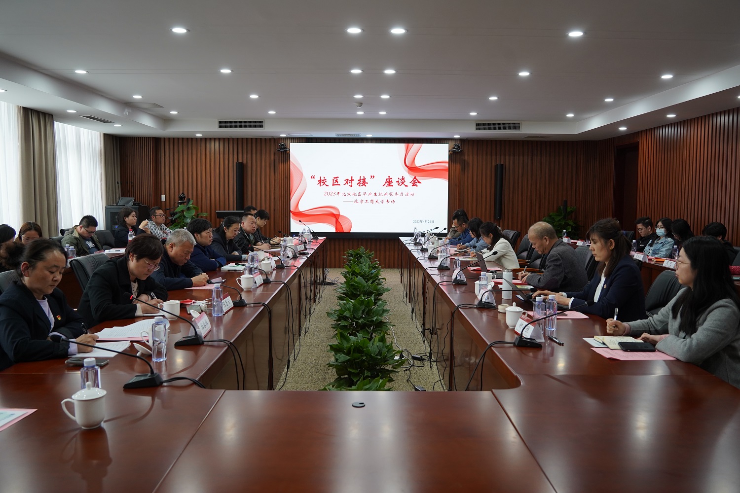 “校区对接”工作座谈会在良乡主校区举办。会上,郑文红介绍了学校的发展历史与办学特色等基本情况,并对市人力社保系统和市就业促进中心的支持和帮助表示感谢。丁玎表示人社局将与学校同向同行,将政策、岗位、信息、指导、培训送进校园,多样化服务形式,与学校形成合力助力毕业生早就业、就好业。