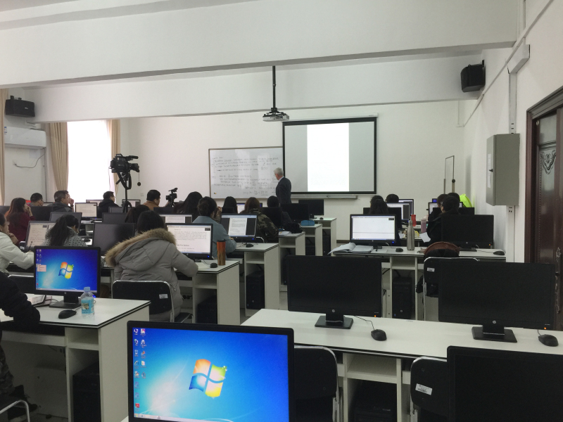 目前,2014级中外合作专业的金融数学模型和R统计软件两门课程都顺利在此实验室讲授。担任金融数学模型主讲的是爱尔兰考克大学数学系主任Bernard Hanzon教授,担任R统计软件主讲的是爱尔兰考克大学数学系Jian Huang教授。