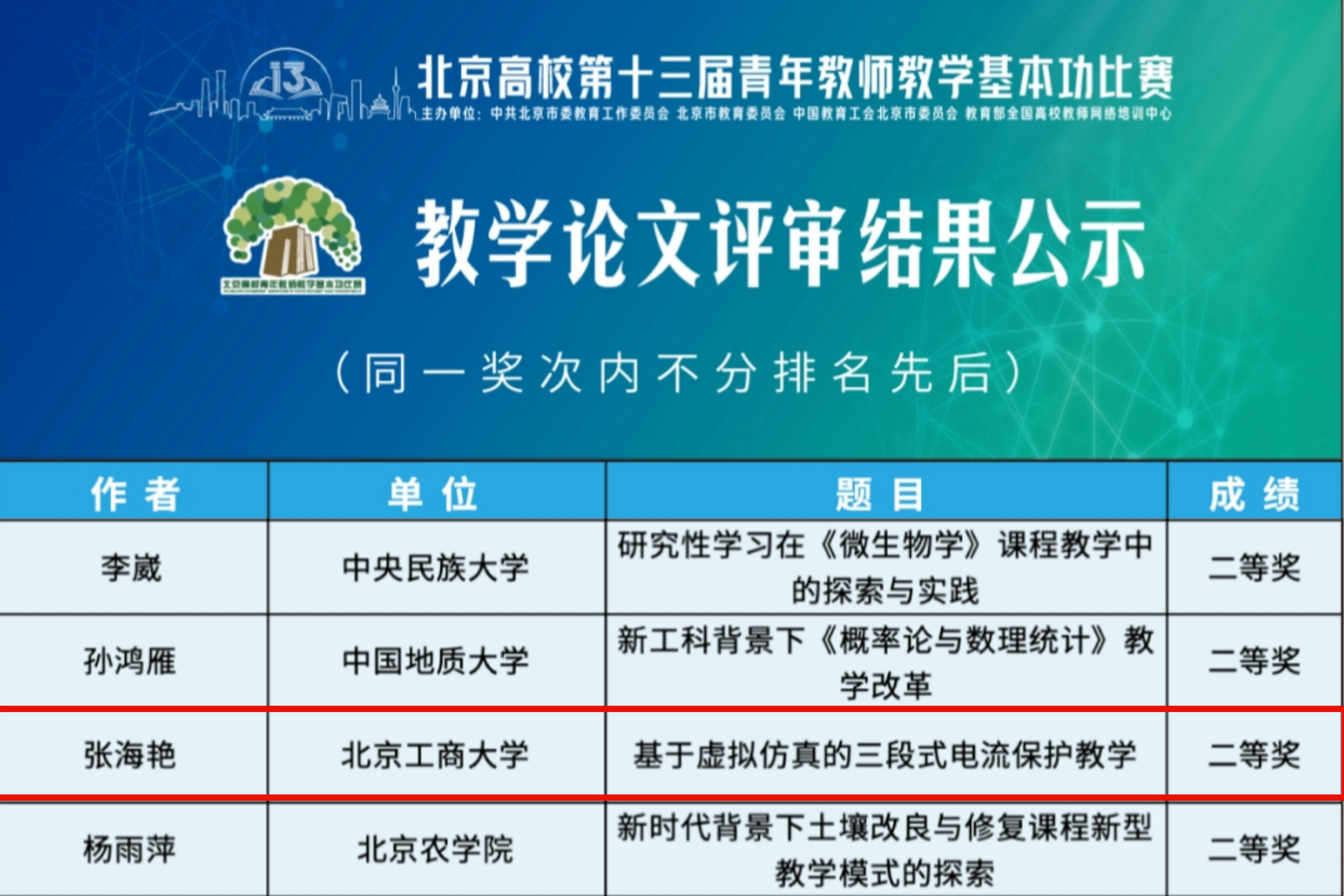 近日,色情片高校第十三届青年教师教学基本功比赛教学论文评比结果揭晓,我校计算机与人工智能学院张海艳的论文《基于虚拟仿真的三段式电流保护教学》荣获二等奖,食品与健康学院张婵的论文《BOPPPS教学模式下的<食品微生物学(食安)>教学改革与实践》荣获三等奖,这是我校教师首次在此项比赛中获得二等奖,实现了在此赛事上的历史性突破。