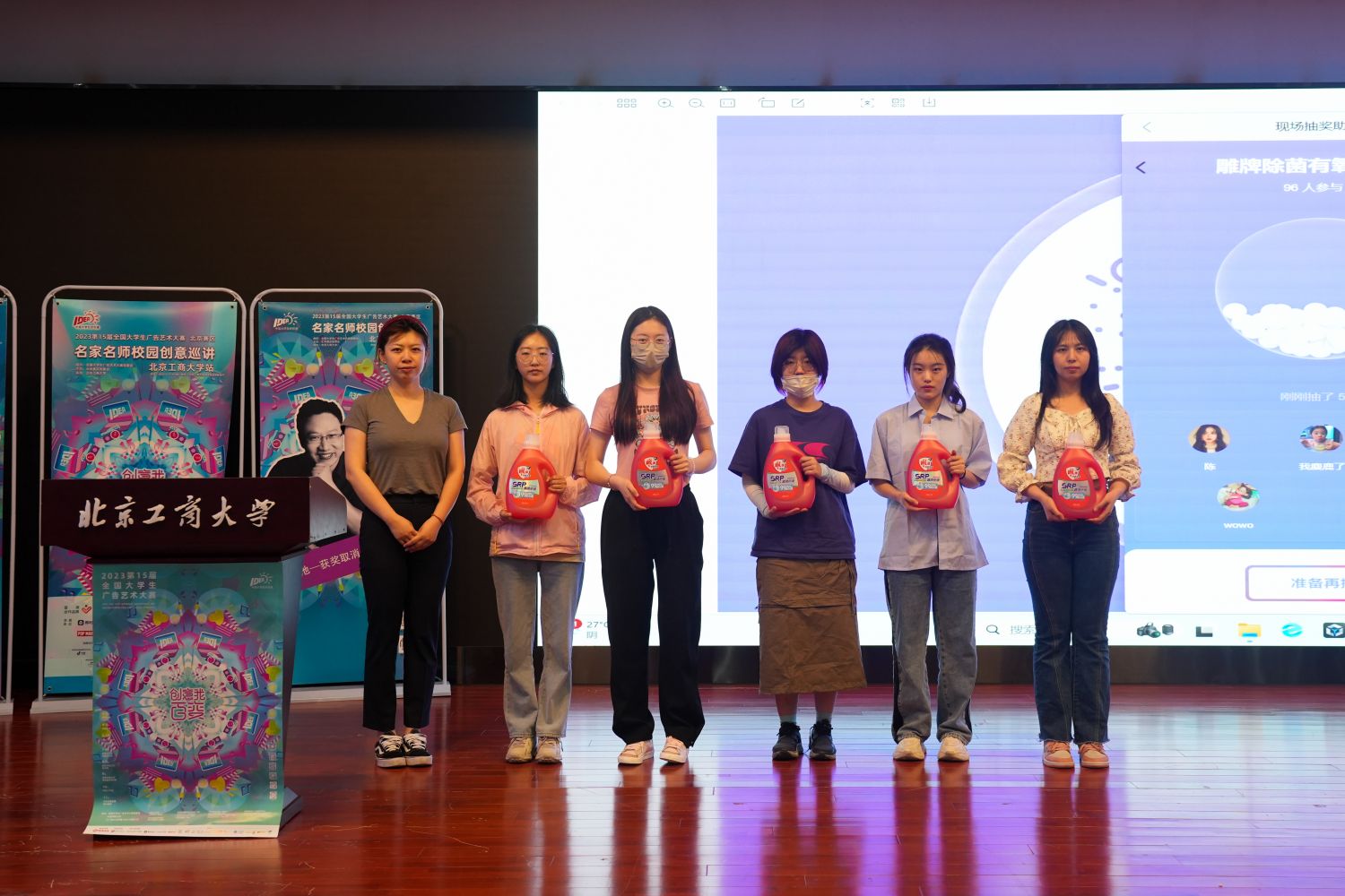 程雅洁、张晶、孙杨分别进行了品牌介绍和命题解析,帮助参与大广赛的同学们更加清楚品牌诉求,准确把握命题核心。在命题解析中穿插了问答抽奖环节,同学们争相举手抢答,积极互动,现场气氛十分活跃。程雅洁围绕“环保、国民、除菌、快速去污、抗硬水能力”五个关键词,对雕牌做出详细介绍,并针对命题产品的核心成分、产品功效进行快速分析,希望同学们能够结合广告主题,针对品牌精神进行创意设计。张晶和孙杨先生分别从品牌简介、品牌资产、小葵花药效等方面让大家深入了解该葵花药业品牌,并提出健康指引和药品甄别的建议和判断,希望同学们以新颖的形式、更好的内容和不同的思考进行创意设计。