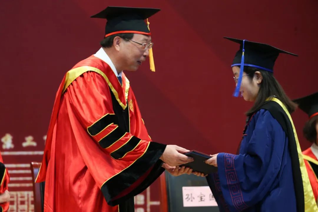 学位授予仪式现场,党委副书记、校长孙宝国为毕业生代表扶苏正冠,党委书记黄先开为毕业生代表颁发毕业证、学位证。
