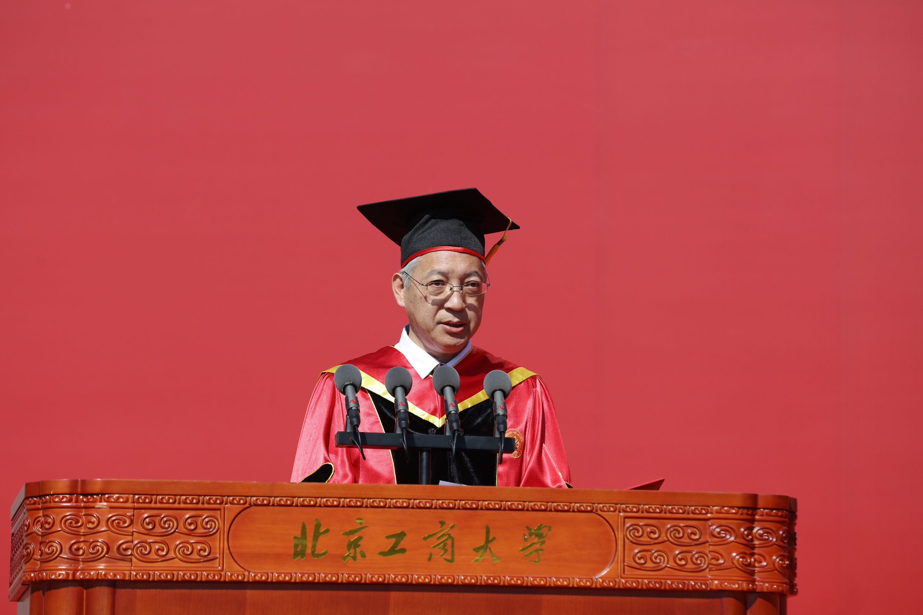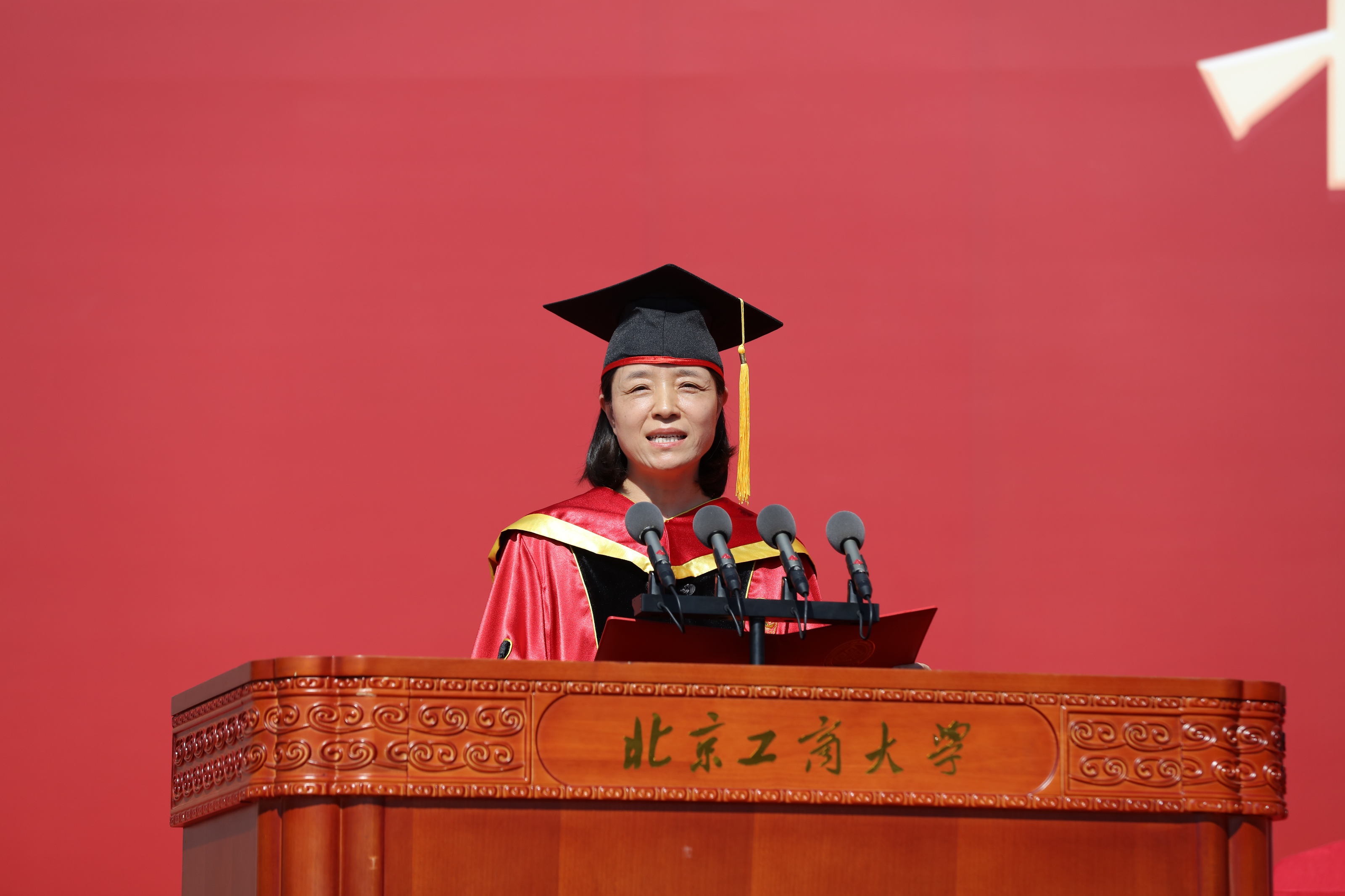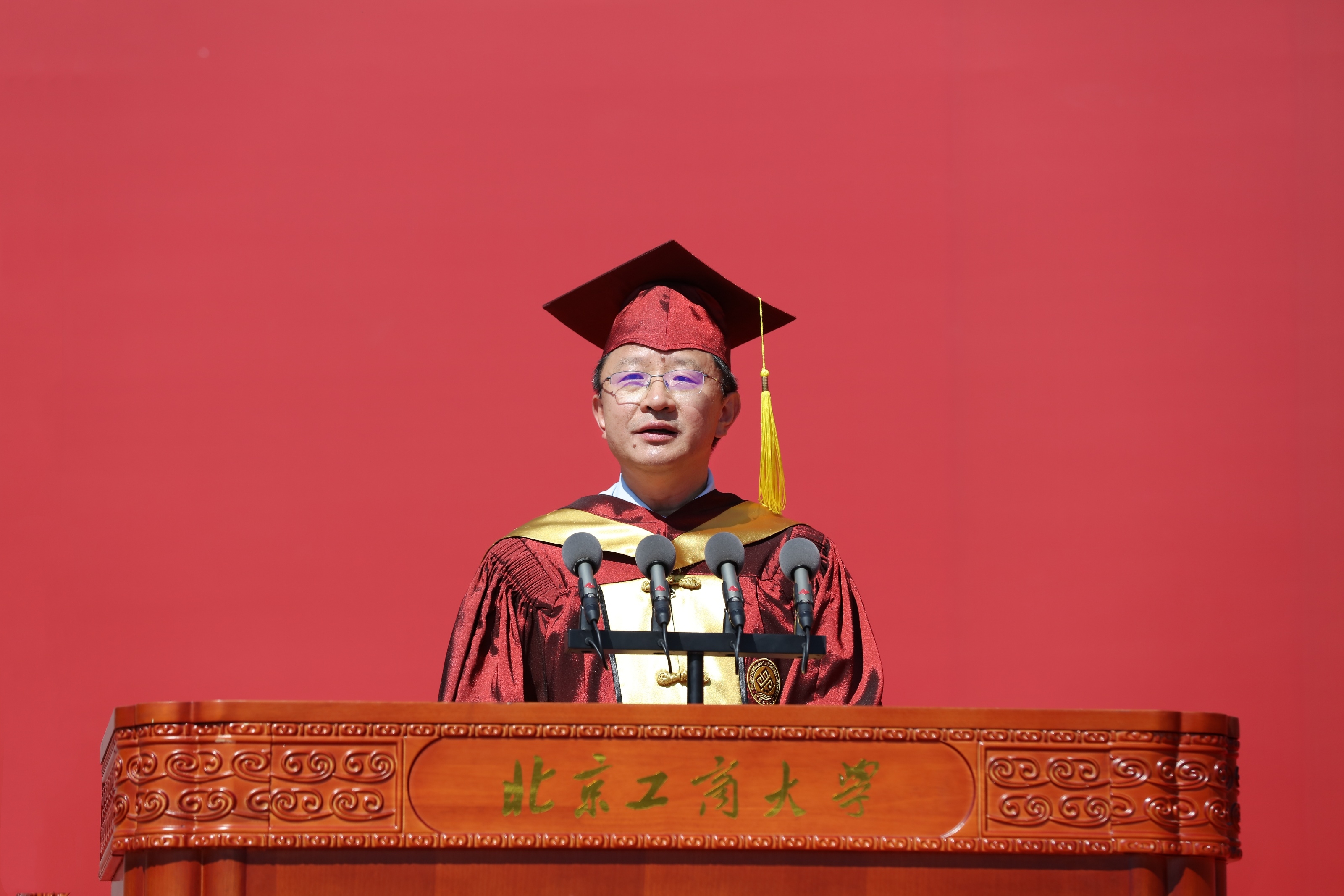 在即将踏上新征程之际,郭建华寄语毕业生们以“工商一体”的独特基因,锚定航向、勇立潮头:一是在时代变局中把稳“定盘星”,做清醒的破局者。“工商一体化”不仅是北工商人的学科底色,更是大家破浪前行的独特利器。希望大家将工科的系统性思维作为“导航仪”,将商科的动态视野作为“雷达屏”,既能用科技重构世界,更要让创新成果惠及众生。二是在创新浪潮中勇当“排头兵”,做硬核的开拓者。毕业不是学习的终点,而是新的起点。希望大家持续攻坚,勇于抢占技术制高点,让艰深的技术语言转化为商业蓝图,让硬核的科研成果焕发市场温度,在人工智能、工业互联网、数字孪生等新赛道,开辟工商协同的新范式。三是在跨界融合中构筑“生态圈”,做关键的连接者。要运用“工商一体化”的思维方式,在未来工作与学习中深度践行“技术研发→产品创新→商业模式→产业生态”的融合链路,用数据讲述中国智造的品质革命,连接中国与世界、当下与未来。四是在人生长跑中锻造“硬实力”,做终身的学习者。人生不是冲刺跑,而是耐力赛。希望大家构建技术功底、管理智慧与人文素养“三角竞争力”,努力用技术创造美好生活,以商业传递核心价值,在强国建设的星辰大海中,书写北工商人的壮阔篇章。