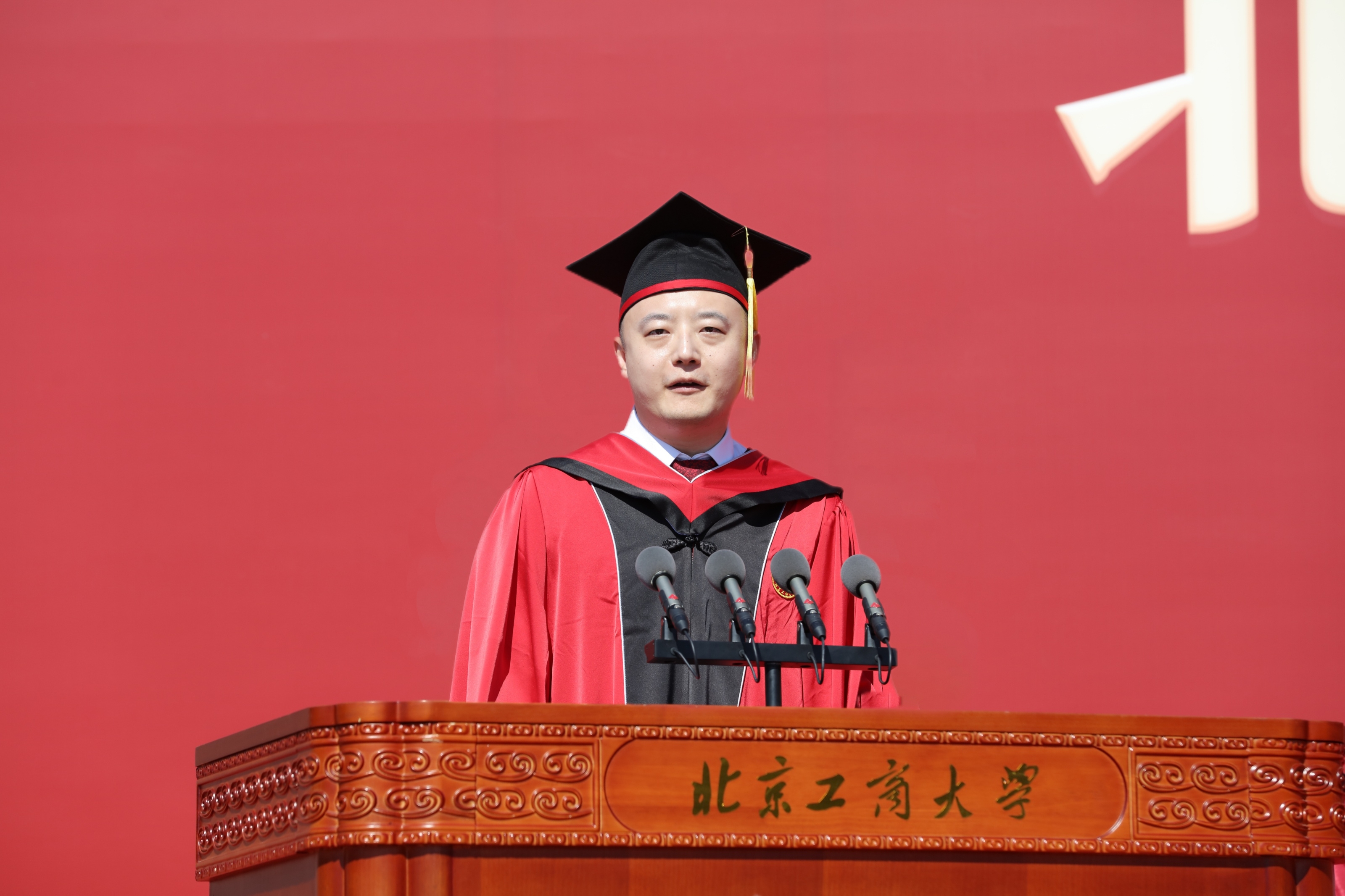 商学院副院长赵川教授代表全体导师发言。作为北工商的毕业生,他希望每位毕业生都能怀着身为“北工商人”的底气走向工作岗位,不管身处何处,都相信母校,以母校为荣。他将“勇于追梦,无惧苍茫”这句话送给毕业生,祝福大家以青春为桨、与祖国共振,以梦为马,奔向属于自己的远方。