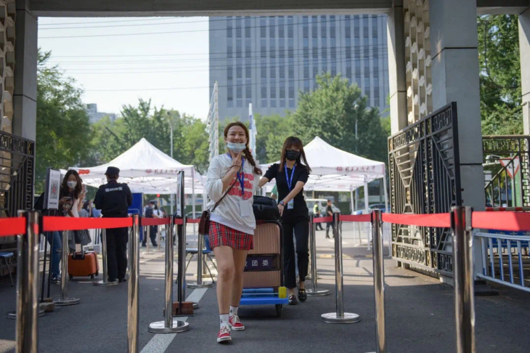 校门引导、身份检测、健康测温,验证健康绿码和行程绿码入校,新生们在安保人员的引导下有序进入校门。