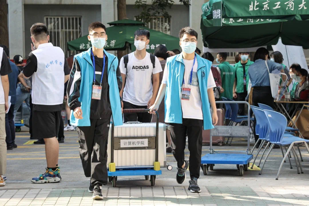志愿者们在校门口热情迎接着新生,帮助新生搬运行李,为他们送上来自北工商的第一份温暖。法学院2021级新生宁欣峤说:“志愿者们非常热情,不仅帮忙搬运行李、引导完成入校手续,还向我介绍学院特色。他们让我的紧张荡然无存,虽然是第一次来,但我觉得自己仿佛早已是北工商大家庭的一员。