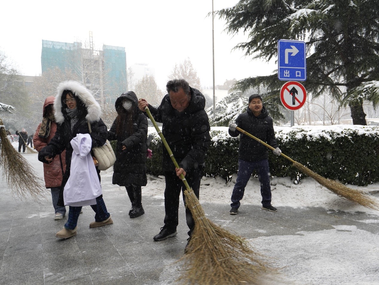 清晨八时,学校党委书记黄先开,党委副书记、校长郭建华等校领导带领机关干部扫雪铲冰,清理路面积雪,保障校园路面畅通。同志们顶风雪、冒严寒,在除雪铲冰的各个关键点位团结协作、干劲十足。一个个浴“雪”奋战的身影,在皑皑白雪中构成了一道美丽的风景线。参与行动的教职工谈到,“大家一起劳动,虽然辛苦,但看到路面清理干净,学生们安全通行,心里感觉暖洋洋的。”