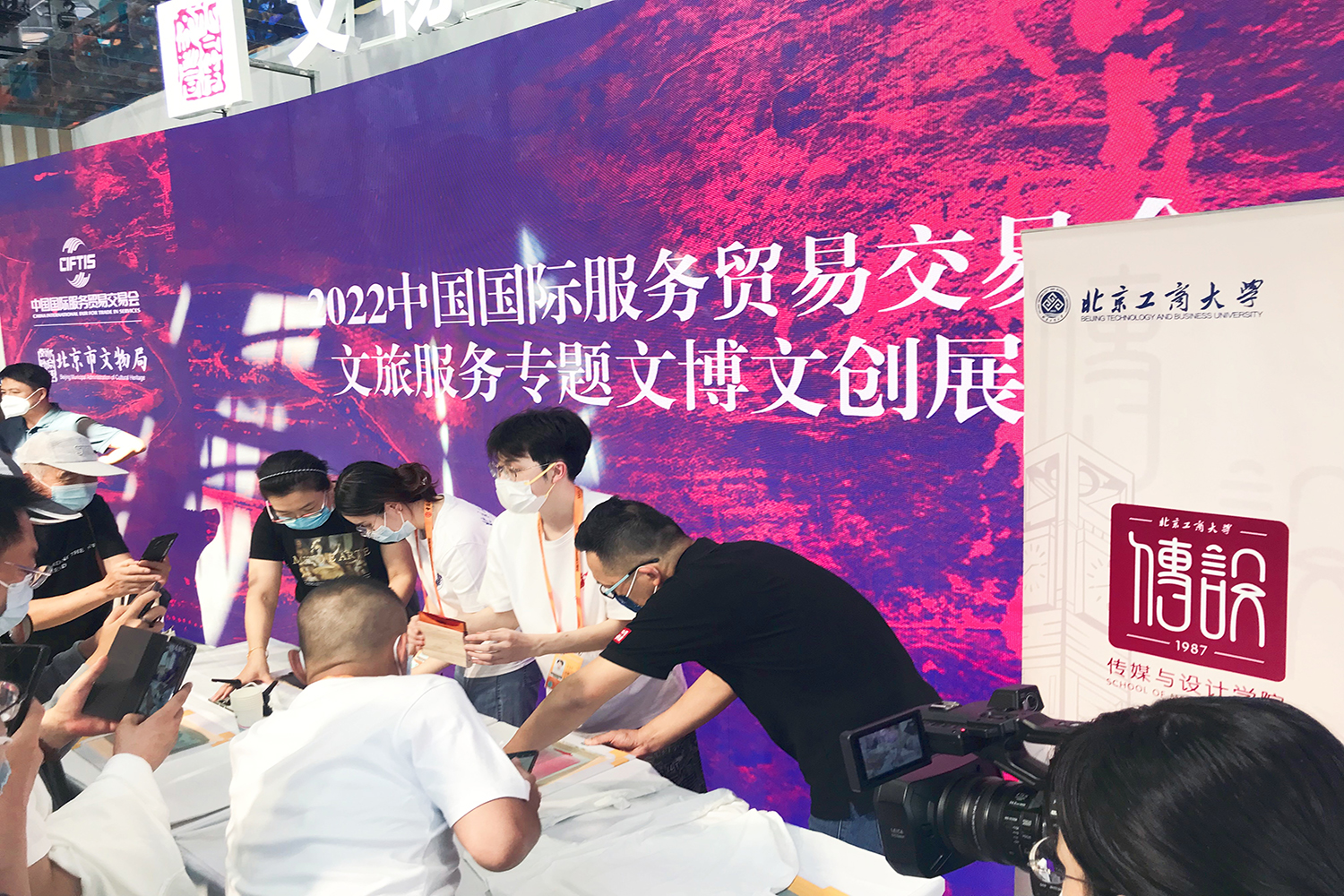 传媒与设计学院设计的文创产品同时亮相本届服贸会文旅服务专题文博文创展区。党委常委、副校长刘敏华、左敏在服贸会相关专题活动结束后,亲临文创展区指导工作。