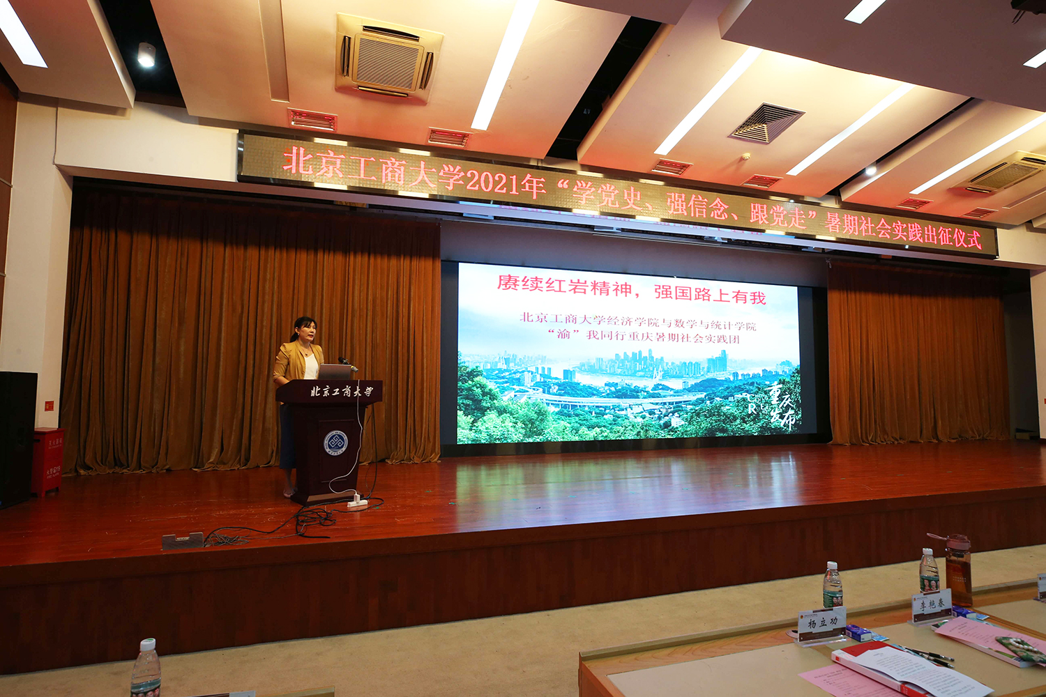 食品与健康学院党委副书记单静敏介绍了由生态环境学院和食品与健康学院联合发起的“探寻延安精神,传承红色血脉”社会实践项目,来自两个学院的实践团成员将重走延安革命圣地,重温“百年大党”的延安精神。人工智能学院党委副书记杨立功介绍了计算机学院和人工智能学院联合实践团的“百年英烈铸党魂,科技奋进续新篇”实践项目,实践团成员将充分融合专业优势,走进中国革命的转折点——贵州遵义,探寻革命老区的科技新篇。经济学院党委副书记李艳春介绍了数学与统计学院与经济学院联合实践团“赓续红岩精神,强国路上有我”的实践项目,实践团成员将去往重庆广泛开展调研,在红岩精神的感化和鼓舞下,担当新时代的青年使命。商学院党委副书记张倩介绍了商学院“寻访初创足迹,读懂建党精神”和“传承奥运薪火,赓续接力奋斗”两个实践专题,商学院的实践团成员将立足新的发展阶段,在初心寻访的路途中,以担当致敬担当,以奋斗接力奋斗。