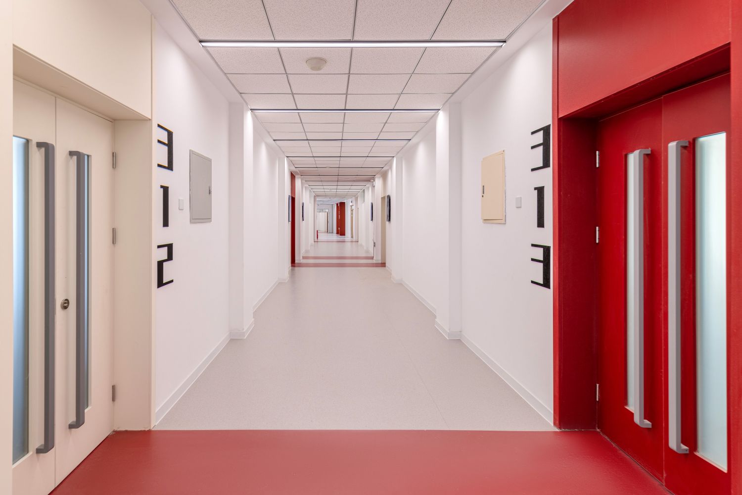 文二楼二、三层的精品教室以木色为主题色,并在家具上点缀楼层主题色,使教室内与公共空间呼应结合。四层的特色学科教室则按照各学科院色区分,使学生对所在的学习环境及学科专业产生归属感。四层新工科阶梯教室则采用食品与健康学院绿色;新商科阶梯教室的主题色采用商学院的红色;艺术类阶梯教室主题色采用传媒与设计学院的蓝色。