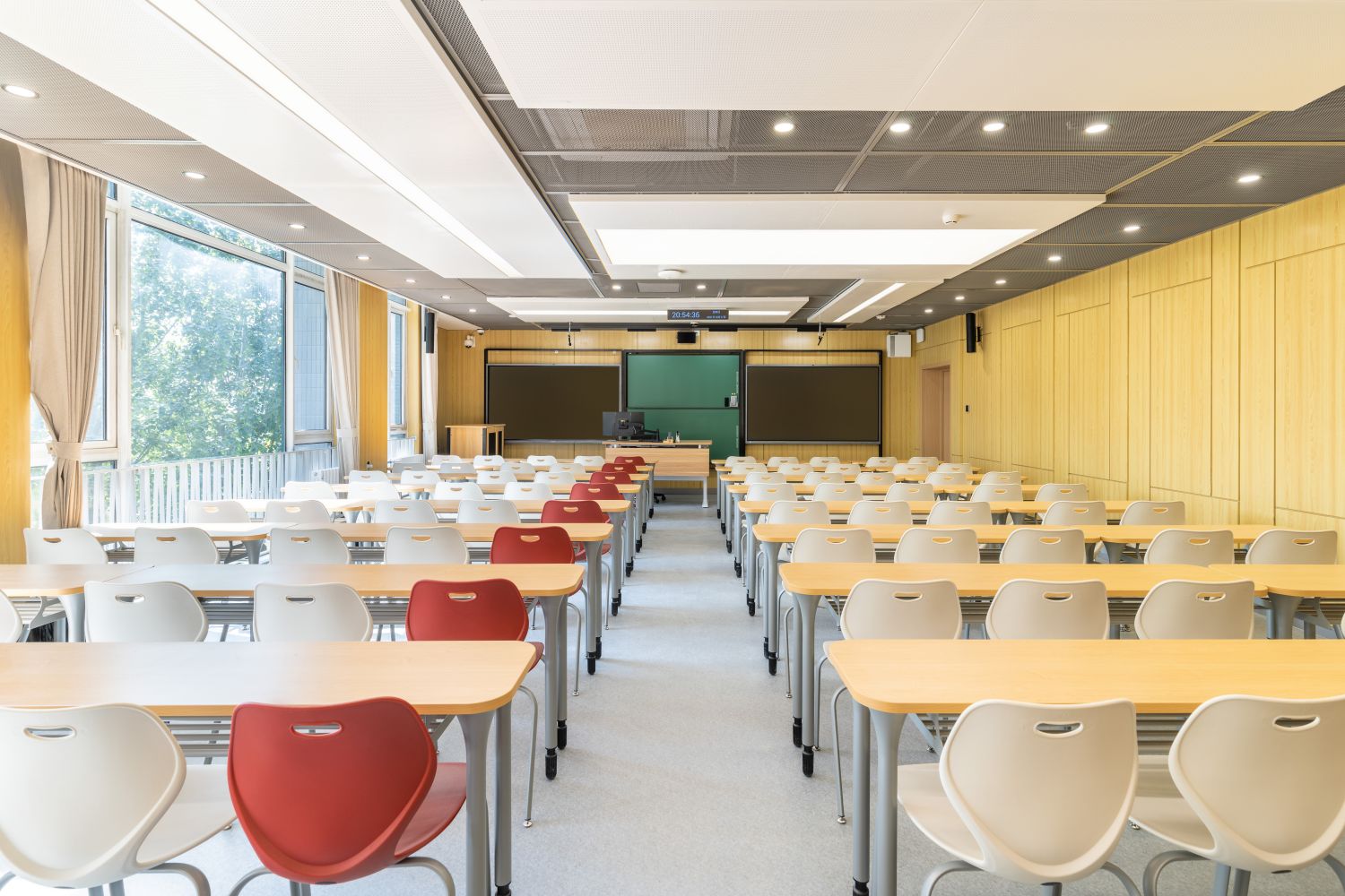 新建智慧教室登录腾讯便可调用教室内摄像头,跟踪教师走动位置,便于线上学生观看教师授课、板书及互动,实现了线上线下混合式教学;提供了大屏、记忆黑板、电子白板、玻璃白板、实物展台等多种书写方式,每间教室黑板多层可推拉,大大增加了书写面积,实现了自由自主、随心便捷的书写模式;考虑到大教室幕布遮挡黑板的情形,中控面板首页设置了一键幕布升降功能,教师可随手调整幕布升降,免去了遮挡困扰;设置多种扩声模式,“一师一麦”、“一室一麦”,辅助吊麦,手持买和吊麦在不同区域讲话自动切换,教师即使未携带任何扩声设备,也不用担心授课扩声问题;电子时钟双面显示,无论教师还是学生微微抬头便可轻松观看时间;教室内教师机显示器采用大屏超薄配置,可触控、可书写,自带隐藏式摄像头,360度可旋转,便利教师教学;教室内使用U盘录制的课堂实录,下课拔走即带走,无需手动下载;教师讲台可升降,配有无尘膜衣粉笔、硬质粉笔、软质粉笔、喷水板擦、干湿两用板擦、电子教鞭、眼镜收纳,讲台边配有水杯托、衣帽钩,学生桌椅也配有桌斗,方便师生放置个人物品。类似的人性化设计细节还有很多,教务处始终秉持教学服务没有止境的理念,用心设计和处理每一处细节,也将在后续教学过程中不断听取师生的使用意见反馈,积累完善,精益求精。