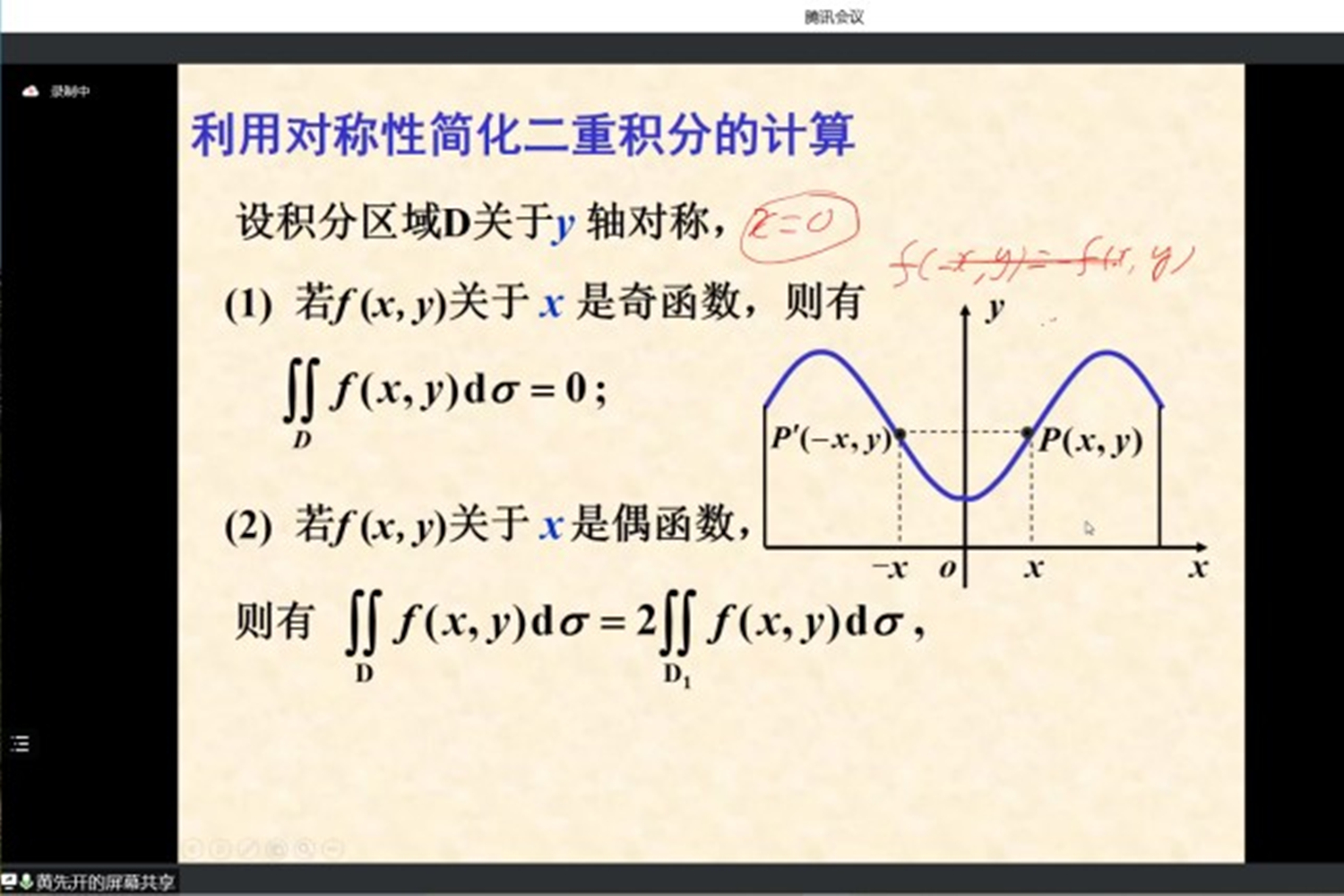 本次课程的主题是二重积分的计算。黄先开教授首先带领同学们复习了二重积分的概念即分割、近似求和、取极限,并用例题讲解二重积分的计算。对于复杂积分区域和无法求出原函数的情况,黄先开教授演示了分解被积区域和变换积分顺序两种方法处理问题,加深了同学们对知识的理解,体现了知识之间的衔接性。黄先开教授强调,直角坐标系下计算二重积分的关键是对积分区域的处理和找到最优解决顺序,并向同学们总结了解题的一般步骤:先观察边界曲线,再寻找函数特征,分析出最优积分顺序。