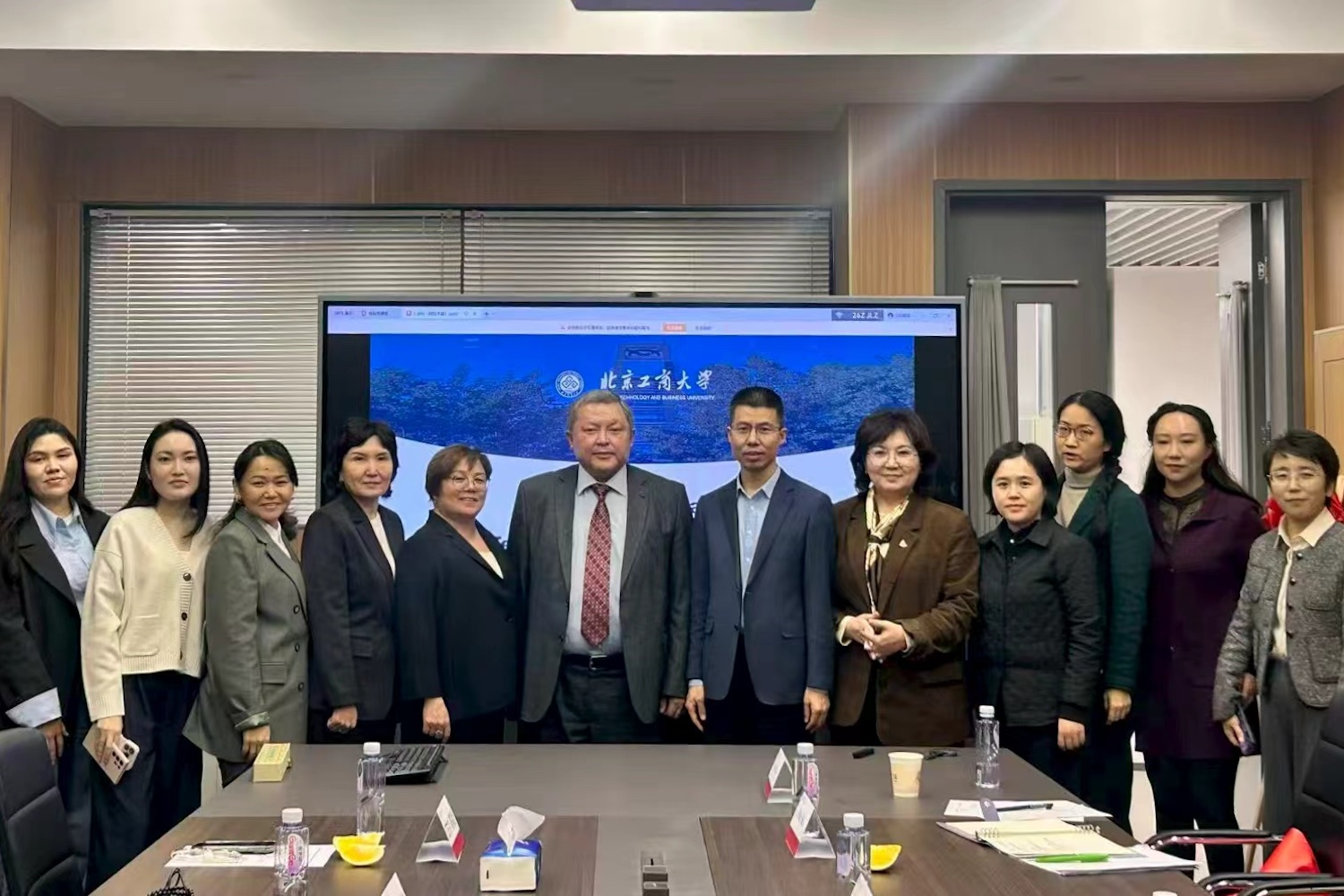 毛新述对巴赫季尔・阿利耶夫一行来访表示诚挚欢迎,并转达了郭建华校长的问候。他回顾了2024年以来两校在校级交流互访、学术科研交流方面的合作,并肯定了中哈技术与创新合作中心所取得的工作进展,希望双方能够继续积极开展多种类的交流,并欢迎更多优秀的哈萨克斯坦学生来北工商学习和交流。