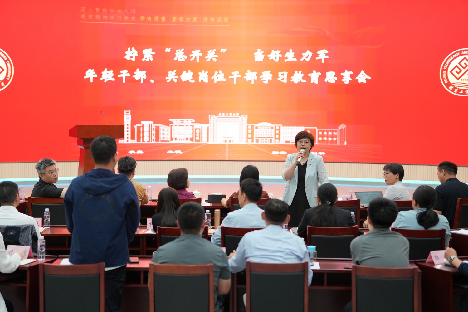 6位年轻干部、关键岗位干部代表进行重点发言。计划财务处处长吕素香立足财务工作分享了守好“纪律红线”、筑牢“廉洁防线”、护航“发展一线”的学习心得;审计处处长李刚谈到,要当好“守护者”和“清醒者”,做“眼里有光、心里有戒、手里有招”的审计人;网络与信息化管理中心主任张珣以“明初心、砺作风、担使命”为主题词,提出要以焦裕禄精神为镜,锻造新时代信息化服务铁军;党政办公室副主任张扬将学习教育成果融入日常实践,阐释了如何在工作中坚持“一个中心”,重点把好“三关”,做好上传下达、切实服务师生;发展规划处副处长毛敏认为,厚植为民心、锻造实干力、淬炼抗压志是新时代年轻干部的成长三境,要以学为基、以干为要,不断磨砺自我、提升境界;人才工作办公室主任于明哲结合履职以来的三件重点工作,表达了年轻干部以实际行动为“忠诚 干净 担当”的新时代党员干部底色增加新注解的拳拳之心。
