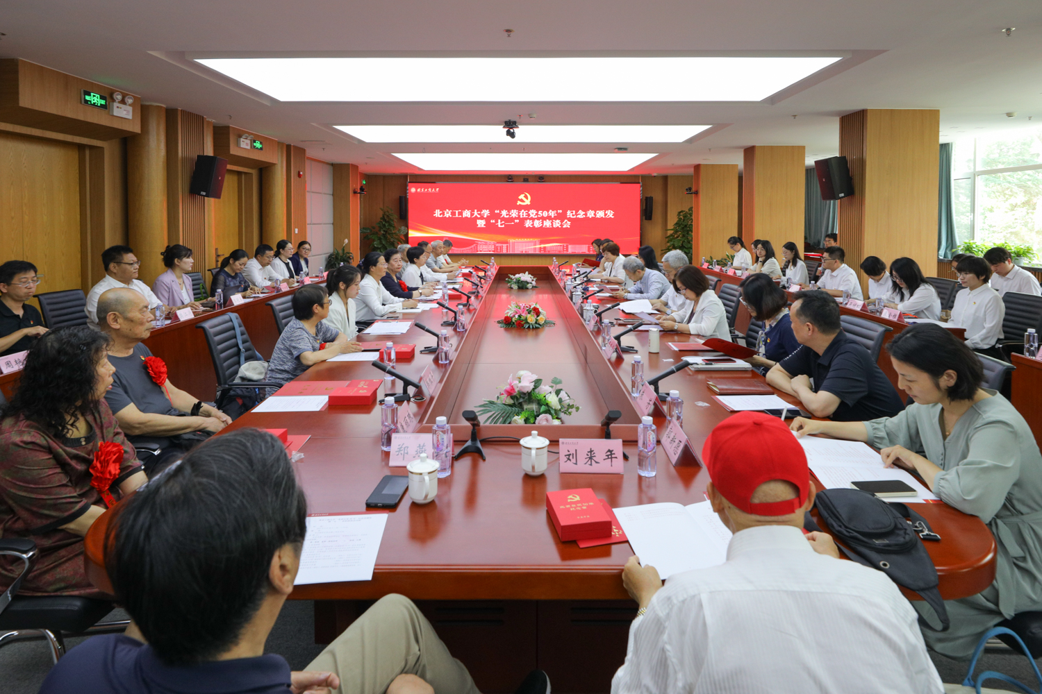 在中国共产党成立104周年之际,为表彰先进典型,弘扬奋斗精神,6月30日,学校召开“光荣在党50年”纪念章颁发暨“七一”表彰座谈会。党委书记沈千帆,党委副书记李中奇、宋晓欣,党委常委、纪委书记、二级高级监察官杨红出席会议。学校党委职能部门负责人,各二级党组织书记以及学校“两优一先”获奖代表,“光荣在党50年”纪念章获得者代表和新党员代表参加会议。座谈会由党委常委、党委组织部部长、党委统战部部长武晶晶主持。