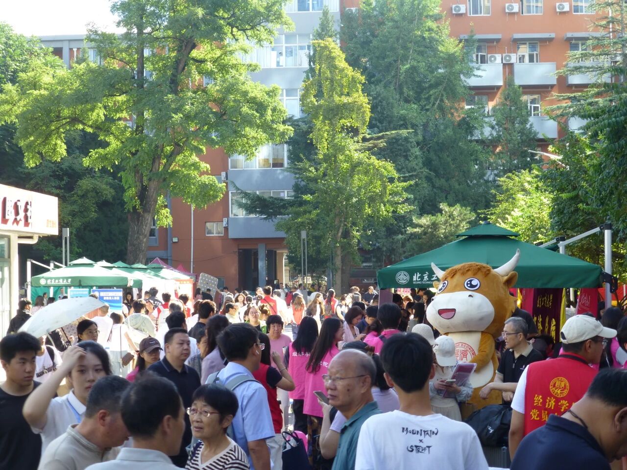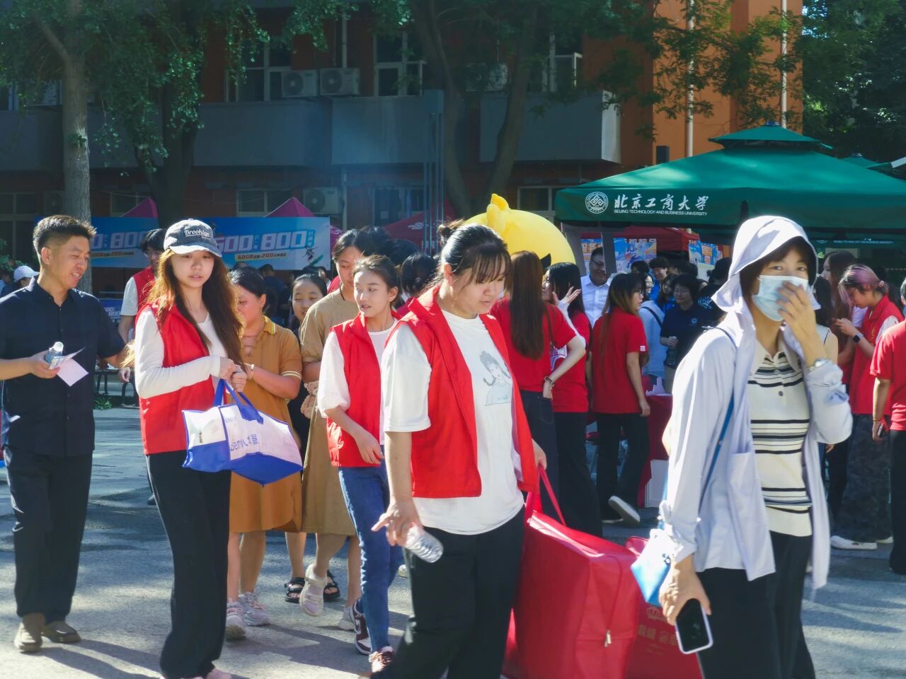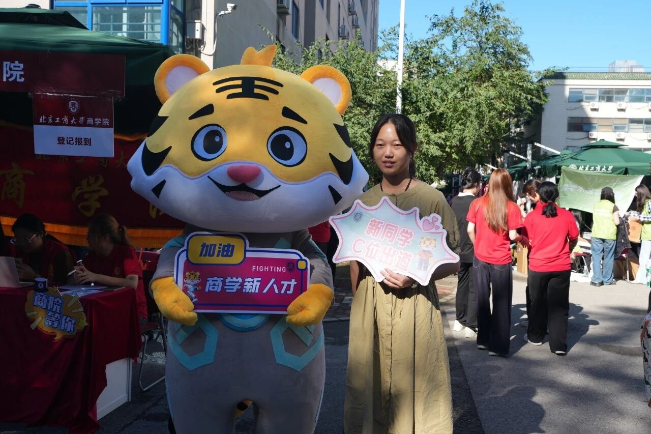 “新起点,新篇章”校门口的巨幅海报、各学院的吉祥物、热情的志愿者,诉说着北工商对新学子们的祝福。