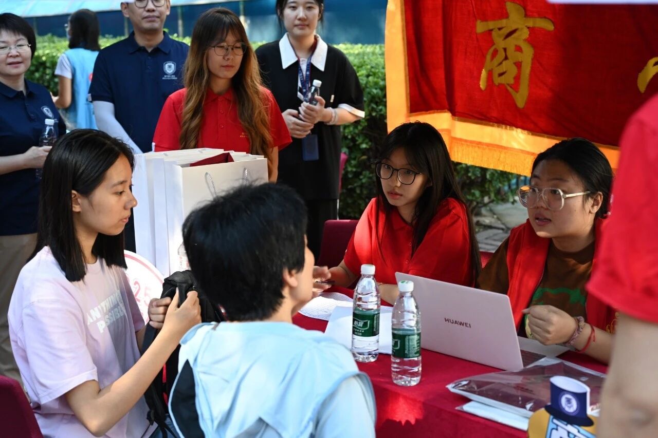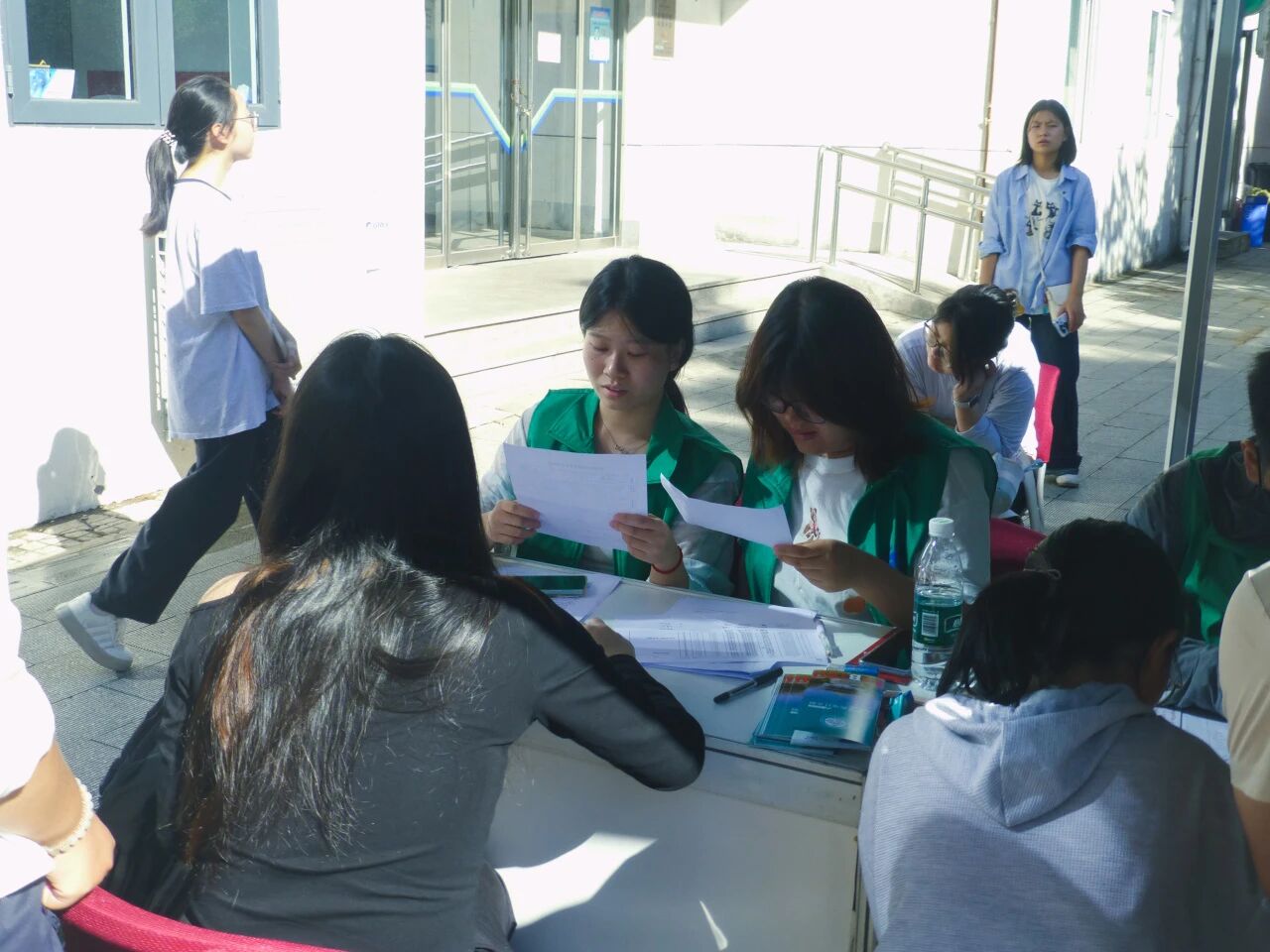 “家长您好,直走是家长休息区”校内的“志愿服务”岗亭,高年级志愿者化身“校园活地图”,一对一为新生细致解答报到流程、课程安排、生活配套等疑问。