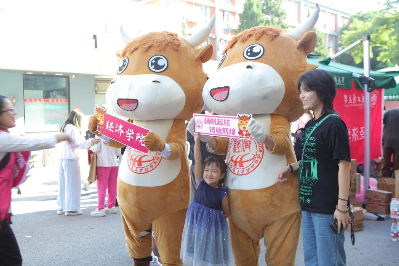 经济学院迎新帐篷旁,学院吉祥物“小犇”也来欢迎新生们的到来;120名志愿者身穿经院“粉”,为新生搬运行李、引导指路、注册登记,确保迎新现场井然有序;学院还为新生准备了贴心“见面礼”:承载学院精神的帆布包、卡套和文件袋,愿他们用包袋装下广博知识,用卡套增进身份认同,用文字书写璀璨未来。