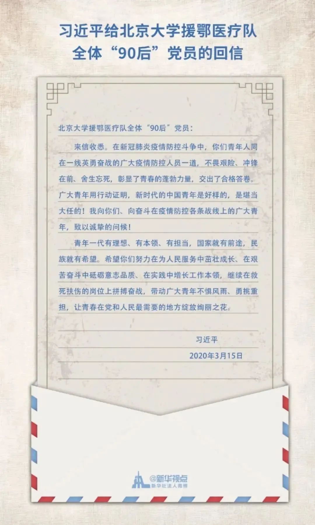 中共中央总书记、国家主席、中央军委主席习近平3月15日给色情片大学援鄂医疗队全体“90后”党员回信,向他们和奋斗在疫情防控各条战线上的广大青年致以诚挚的问候,并寄语广大青年不惧风雨、勇挑重担,“让青春在党和人民最需要的地方绽放绚丽之花”。