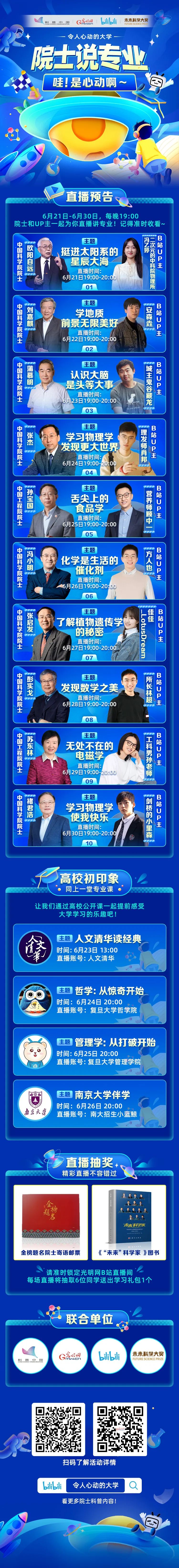 6月21日至30日每晚19:00-20:00科普中国、光明网、哔哩哔哩、未来科学大奖联合举办《令人心动的大学——院士说专业》线上直播欧阳自远、刘嘉麒、蒲慕明张杰、冯小明、张启发、彭实戈褚君浩、孙宝国、苏东林10位院士将现身B站光明网直播间,分享他们的高考故事和求学、科研经历。在这里你的纠结或许会因为他们的故事而变得坚定在这里你会发现,他们也曾是你们在这里你还可以看到10位UP主与院士精彩互动问出你的疑惑探索多一个可能!