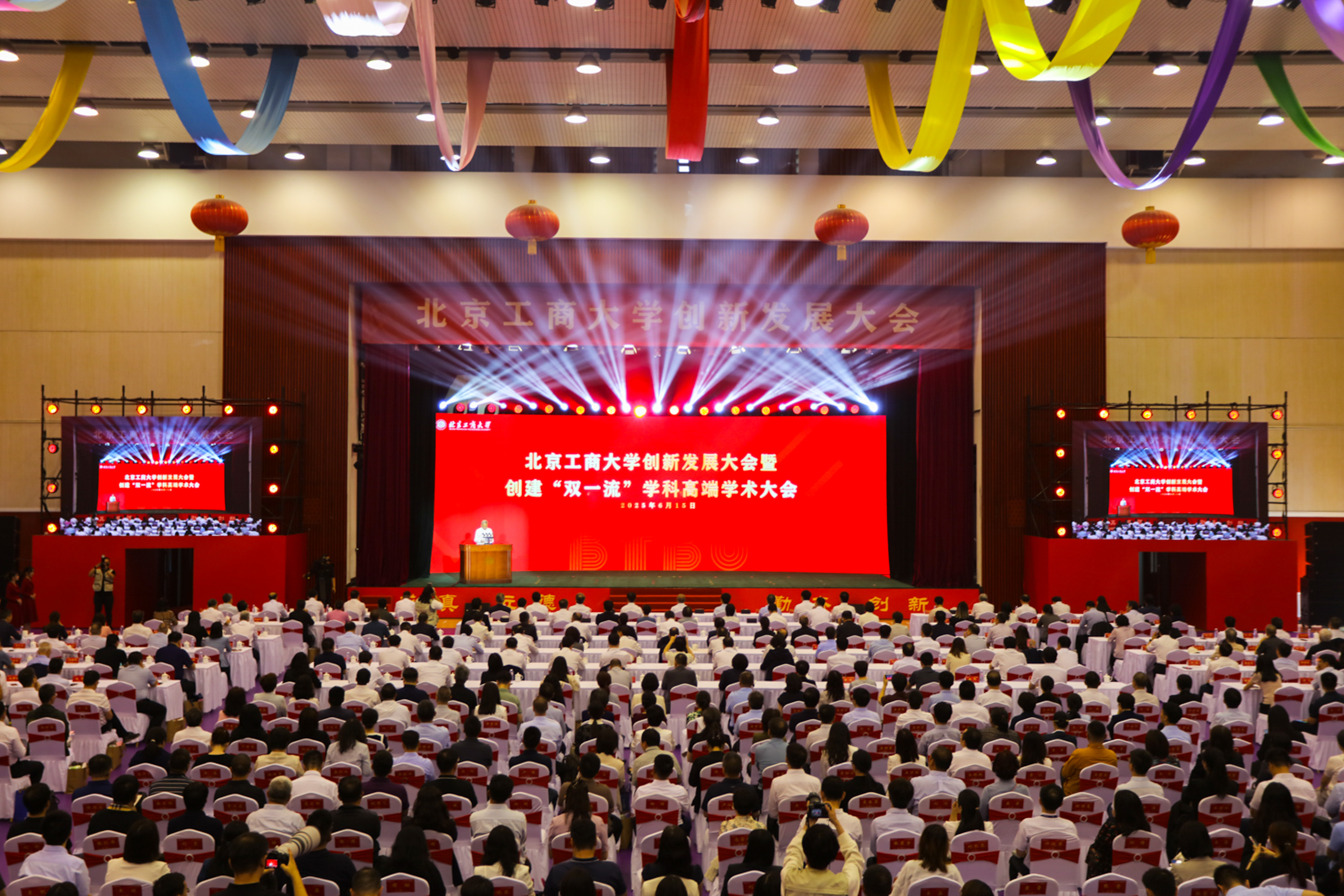 校党委副书记、校长郭建华作学校创新发展成果及创建“双一流”情况报告。他代表学校全体师生员工,向关心支持学校发展的各级领导、各界朋友、广大校友,致以热烈欢迎和衷心感谢。他回顾了学校从建校到三校合一、再到 “工商一体” 新征程的发展历程,汇报了学校在学科建设、人才培养、科学研究、师资队伍建设等方面取得的丰硕成果。他强调,建设世界一流大学和一流学科既是国家教育强国战略的迫切要求,更是学校自身发展的内在需要。他号召全校师生以此次大会为新起点:以“工商一体”之智,争当教育强国建设的先锋队;以“奋进一流”之志,争当科技自立自强的突击队;以“经世济民”之责,争当区域协调发展的主力军,在中国式现代化和新时代首都发展的壮阔征程上展现北工商担当。