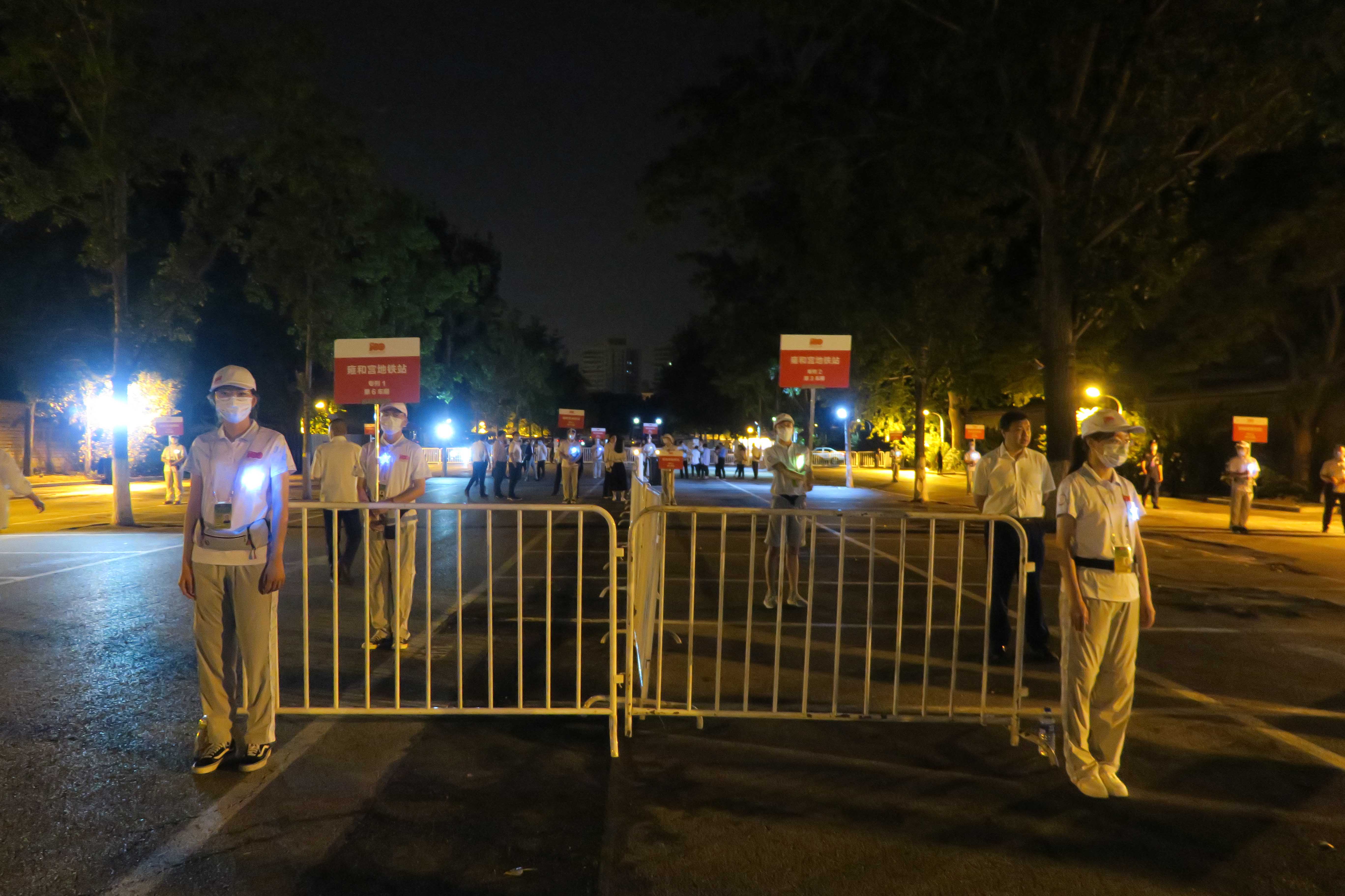 7月1日1点,第一批观礼人员陆续到达各自制定的集结点。在大巴集散区,负责交通引导的志愿者有序排列在大巴停放处,他们手持醒目的蓝色引导牌,指引大巴有序停放、主动与大巴车长核实乘客数量,并引导乘客按照指定的流线行进。地铁集结点的志愿者则负责手举不同专列的地铁指引牌,引导观众有序在各自专列等候区排队。在观众集结完成后,志愿者要继续高举指示牌带领观众从集结区到地铁站乘坐专列,在把最后一批观众送上前往天安门广场的专列之后,志愿者已经手举指示牌长达5个小时。测温区和安检区的志愿者,分别协助医务人员及公安民警完成体温检测和安检工作。测温区和安检区的人流量很大,但他们毫无松懈,一直聚精会神地盯着眼前的屏幕,用专注和严谨为庆祝大会的观礼人员筑起安全健康防线。还有一部分志愿者化身“搬运工”,帮助工作人员运送随车保障物资、交通指示标志等。他们不怕困难,配合默契,齐心协力,团结一致,仿佛他们接力的不是沉甸甸的纸箱,而是铺就百年信仰的砖石。