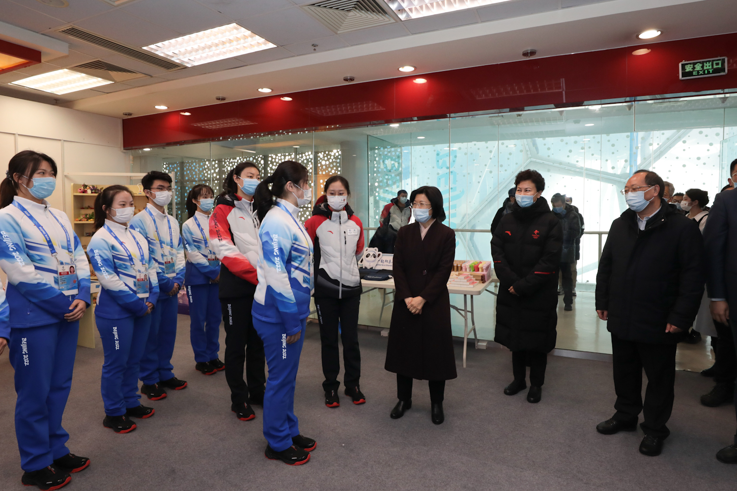 孙梅君部长一行参观了国家游泳中心比赛大厅,场馆主任张杰从场馆水冰转换、志愿者基本情况和防疫三个方面做了重点介绍,孙梅君部长与我校在现场服务的志愿者进行了互动。
