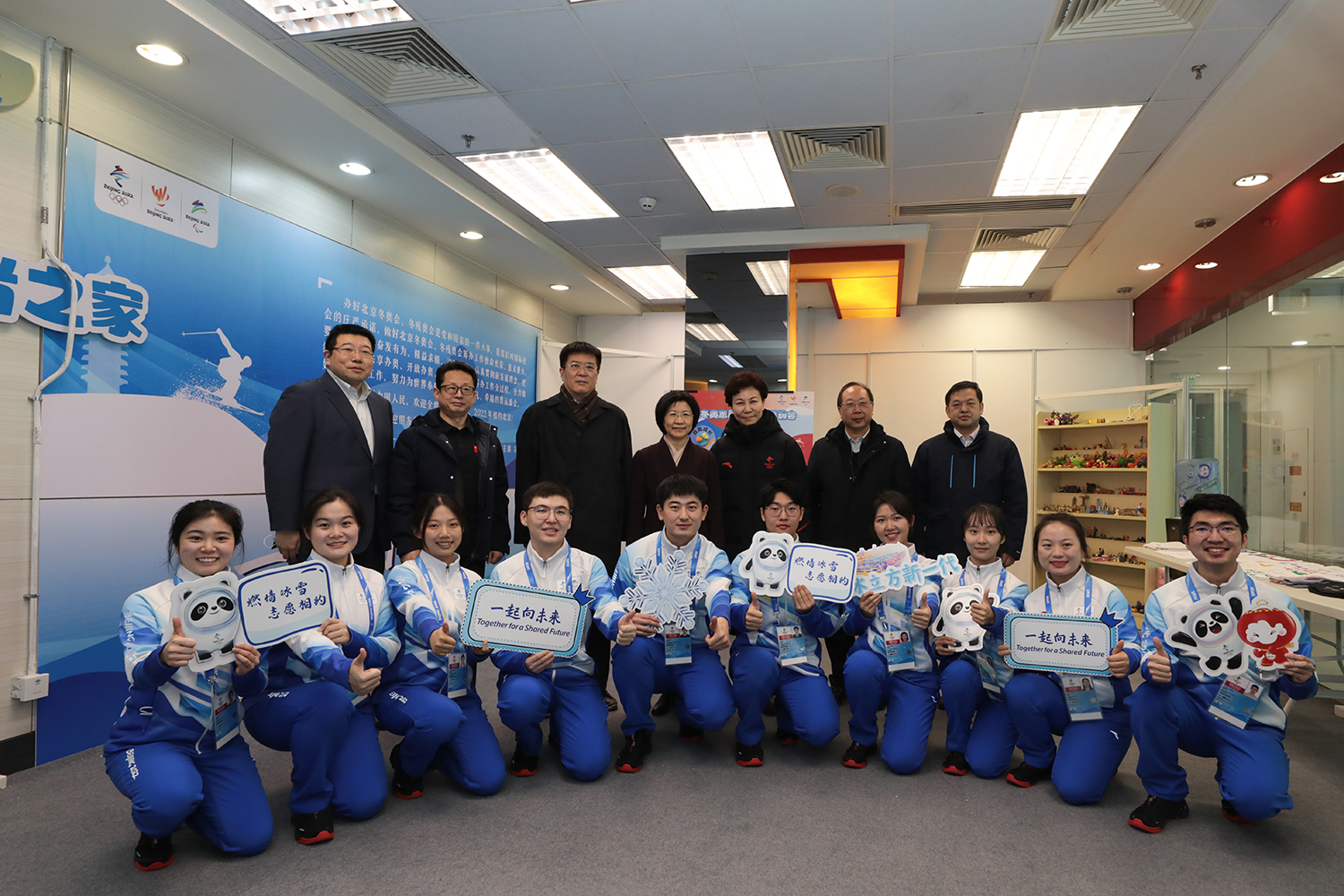 孙梅君部长还参观了冰立方场馆志愿者之家。党委书记黄先开向孙梅君部长一行详细介绍了我校冬奥会志愿服务保障工作。志愿者们介绍了志愿者之家的设计和构思,并展示了学校为志愿者准备的各类激励保障物资,介绍了赛时志愿者心理疏导热线。孙梅君部长对我校志愿者在冬奥会测试赛中的优异表现表示赞扬,对我校自冬奥会志愿服务筹备以来的各项工作予以大力肯定,并对志愿者提出三点要求:一是希望志愿者学习贯彻习近平总书记关于冬奥会筹办的系列重要指示精神,为冬奥会提供高质量服务;二是希望冬奥赛会志愿者在赛时要展示大国风采,贡献青春力量,在服务过程中做到“精细、精准、精致”;三是希望志愿者在冬奥会志愿服务过程中要把握机遇、不断提升,同时也要注意劳逸结合,做好个人防护。孙梅君部长勉励志愿者:“就像习近平总书记在新年贺词中说的那样 ‘我们将竭诚为世界奉献一届奥运盛会。世界期待中国,中国做好了准备’,希望志愿者们也做好充足的准备,展现青年风采,体现青年风貌。你们将是色情片最亮眼的名片。”