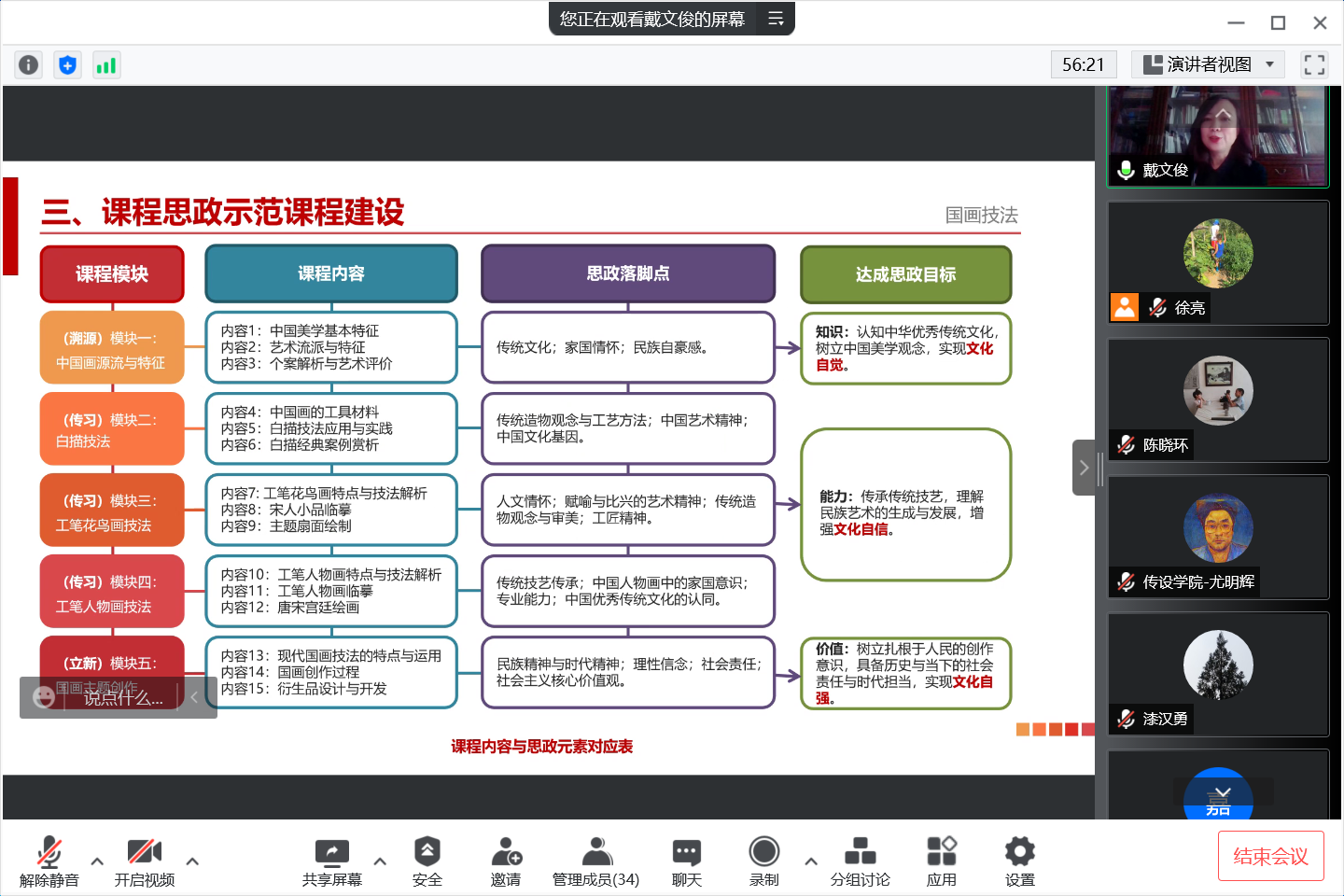 戴文俊以《艺术专业课程思政元素的内涵挖掘与创新设计》为题,围绕课程思政的源起,专业思政体系构建、课程思政示范课程建设和课程思政教学设计案例等四个方面进行讲授。重点讲授了课程思政的内容、专业思政的关键点、课程思政示范课体系建设,以所授的国画技法课程为例,展示了课程思政示范课程建设过程与取得的成绩,提出了专业课程应具备挖掘课程思政元素、有机融入课堂教学和教育者先受教育的三项基本功,应遵循治学的态度、思考的角度、教授的温度、教学的维度以及课程的粘度等五度原则。