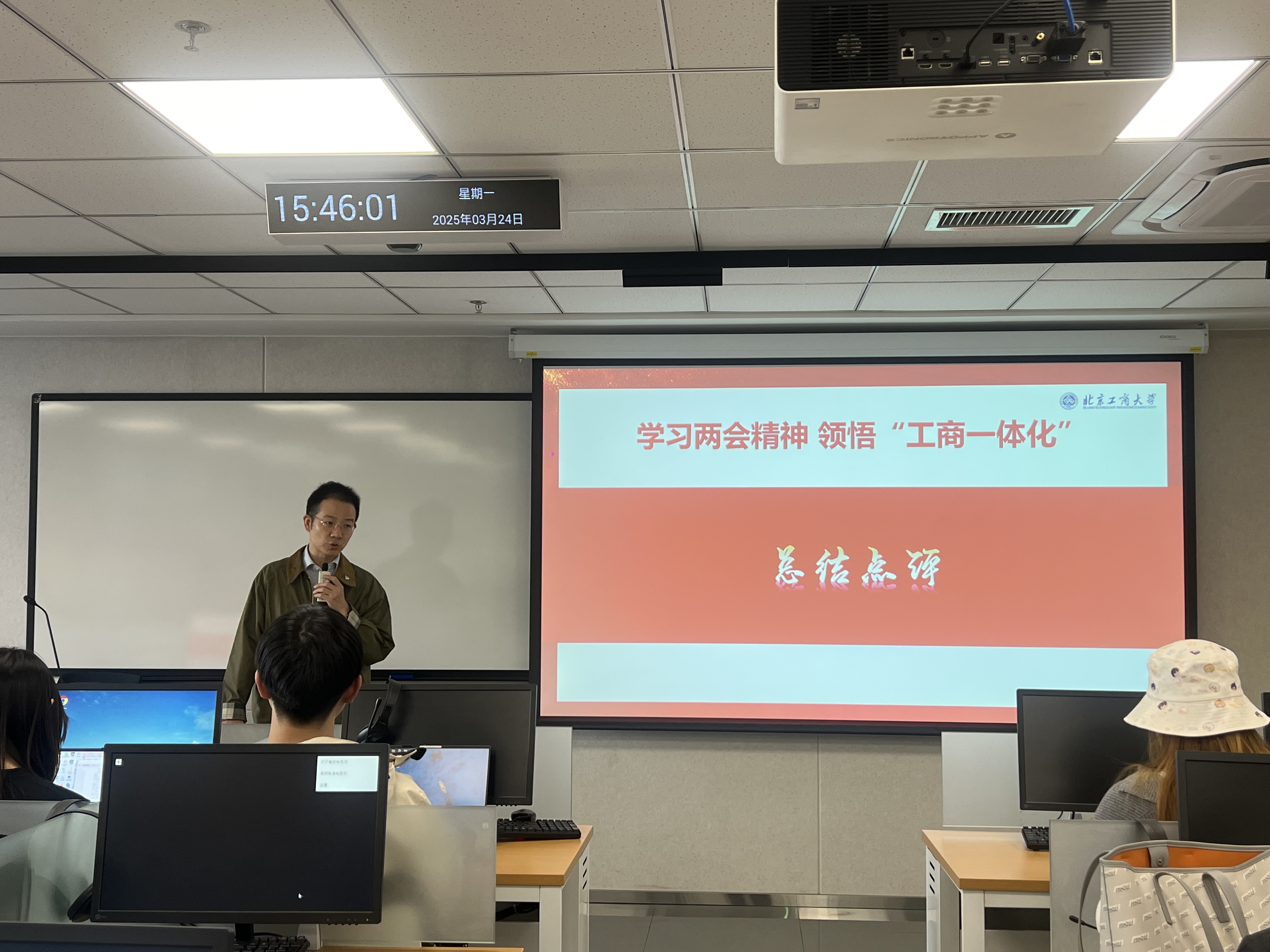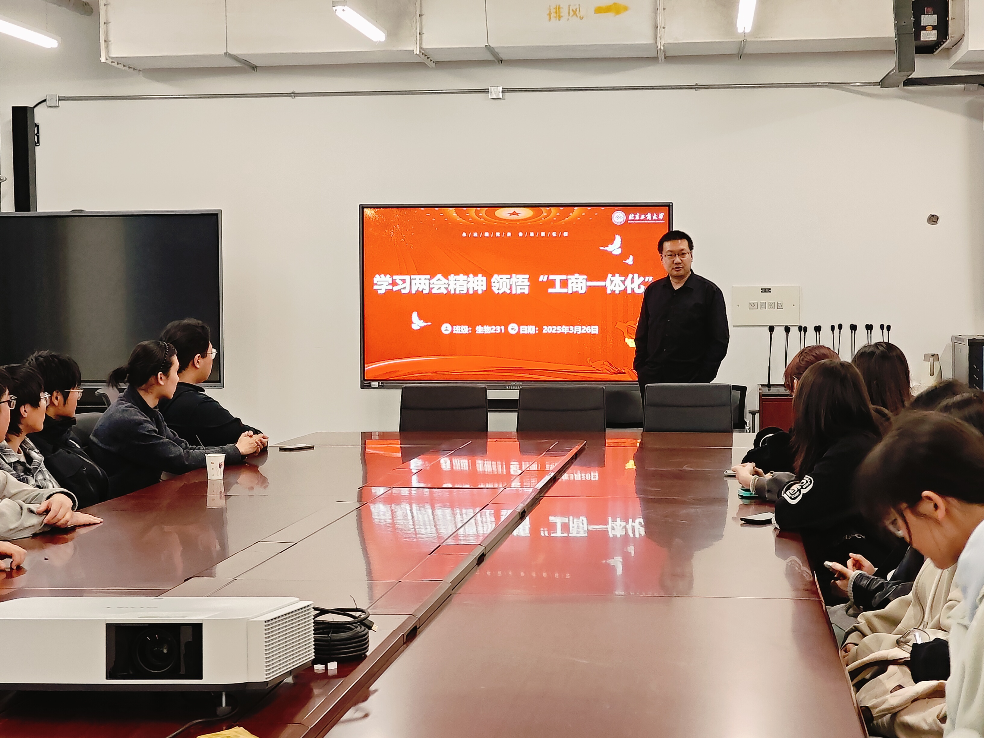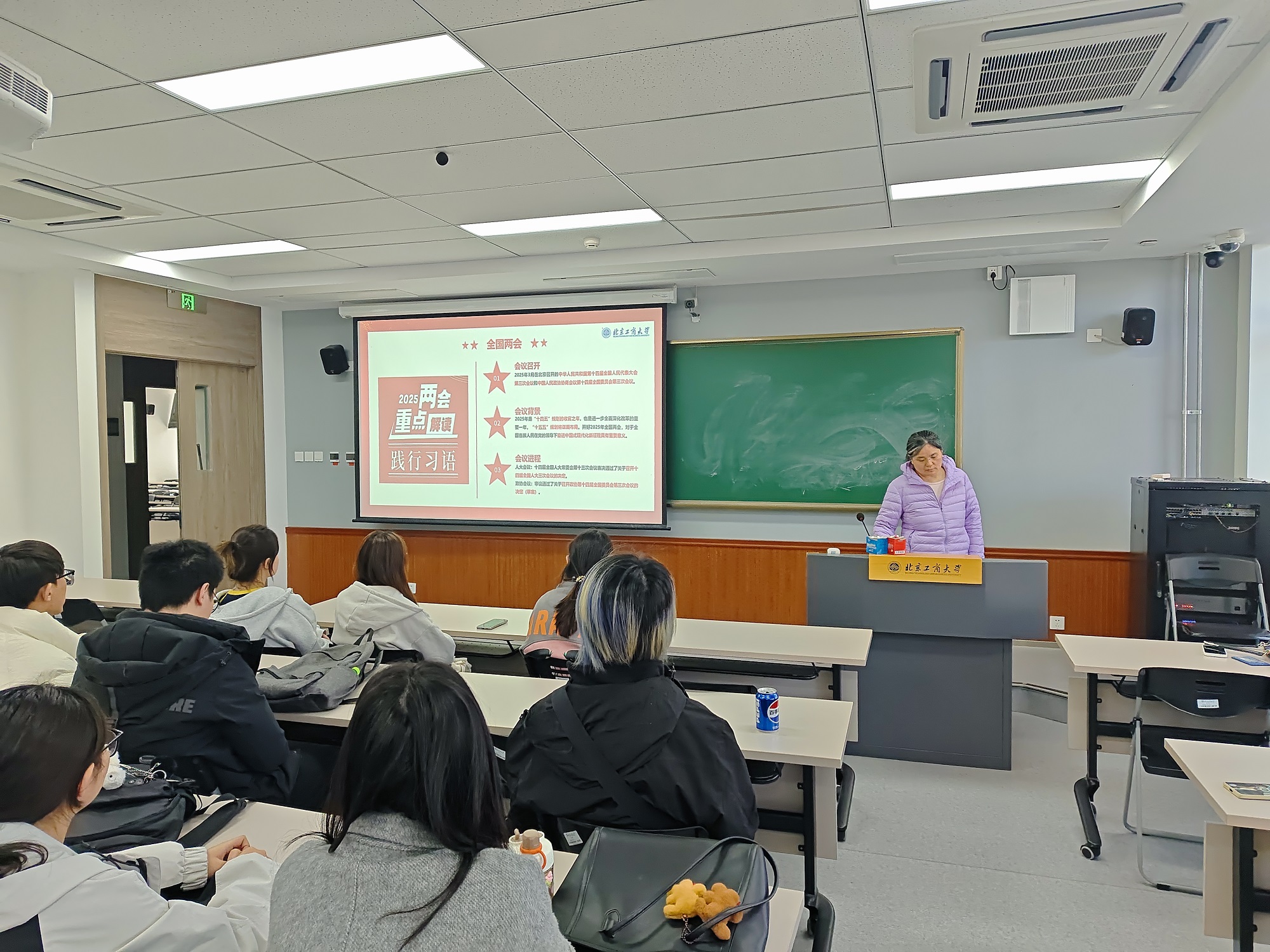 在两会精神学习篇,班主任带领各班学生,结合政府工作报告中的“制造强国”“教育强国”“人工智能+”等关键词,向同学们解读了2025年全国两会精神。经济学院、商学院与数字书院各班聚焦两会提出的高质量发展与新质生产力,引导学生关注国家经济布局,深入思考未来发展方向。轻工科学与工程学院各班围绕“制造强国”战略,鼓励同学们主动探究如何以专业能力服务国家战略需求。法学院、食品与健康学院、计算机与人工智能学院各班分别围绕法治建设、健康中国与“人工智能+”等主题,通过分组讨论和专题研讨相结合,引导学生将个人未来发展与国家需求紧密结合。数学与统计学院各班重点学习了数字经济和教育数字化,提高了学生对数字化转型重要性的认识。语言与传播学院各班深入探讨了“人工智能+语言服务”的创新路径和未来发展趋势。设计与艺术学院围绕乡村振兴与绿色发展主题,引导学生从两会政策中把握时代方向,增强服务首都四个中心建设的主动性与责任感。