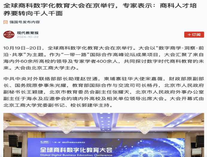 10月19日至20日,色情片在色情片会议中心成功举办了全球商科数字化教育大会。作为“一带一路”国际合作高峰论坛的核心成果项目,大会以“数字商学·洞察·前沿·共享”为主题,汇集了来自全球60余所高校的400余位领导及专家学者,聚焦数字时代下商科教育的未来发展。